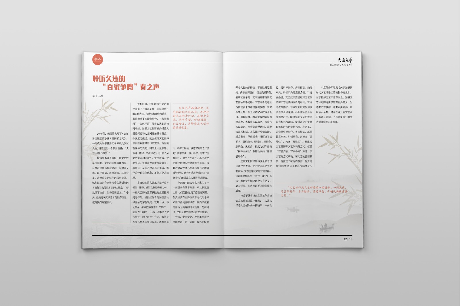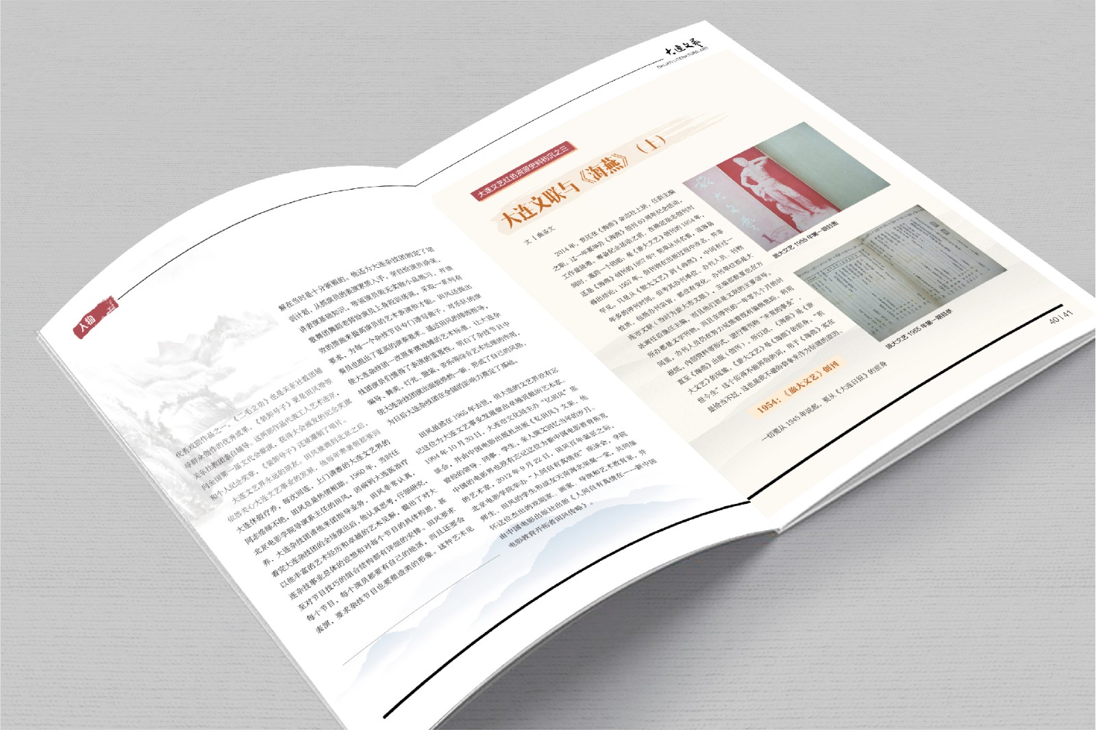创意共和大连设计公司为大连市文联提供杂志设计服务,《大连文艺》整体文化感十足,讲述大连这些年文艺界的一些故事和影响深远的人,让读者了解大连文艺界的事和人。水墨风和适当的留白,也让整本杂志更具美观和阅读的趣味,打破刻板,推陈出新。