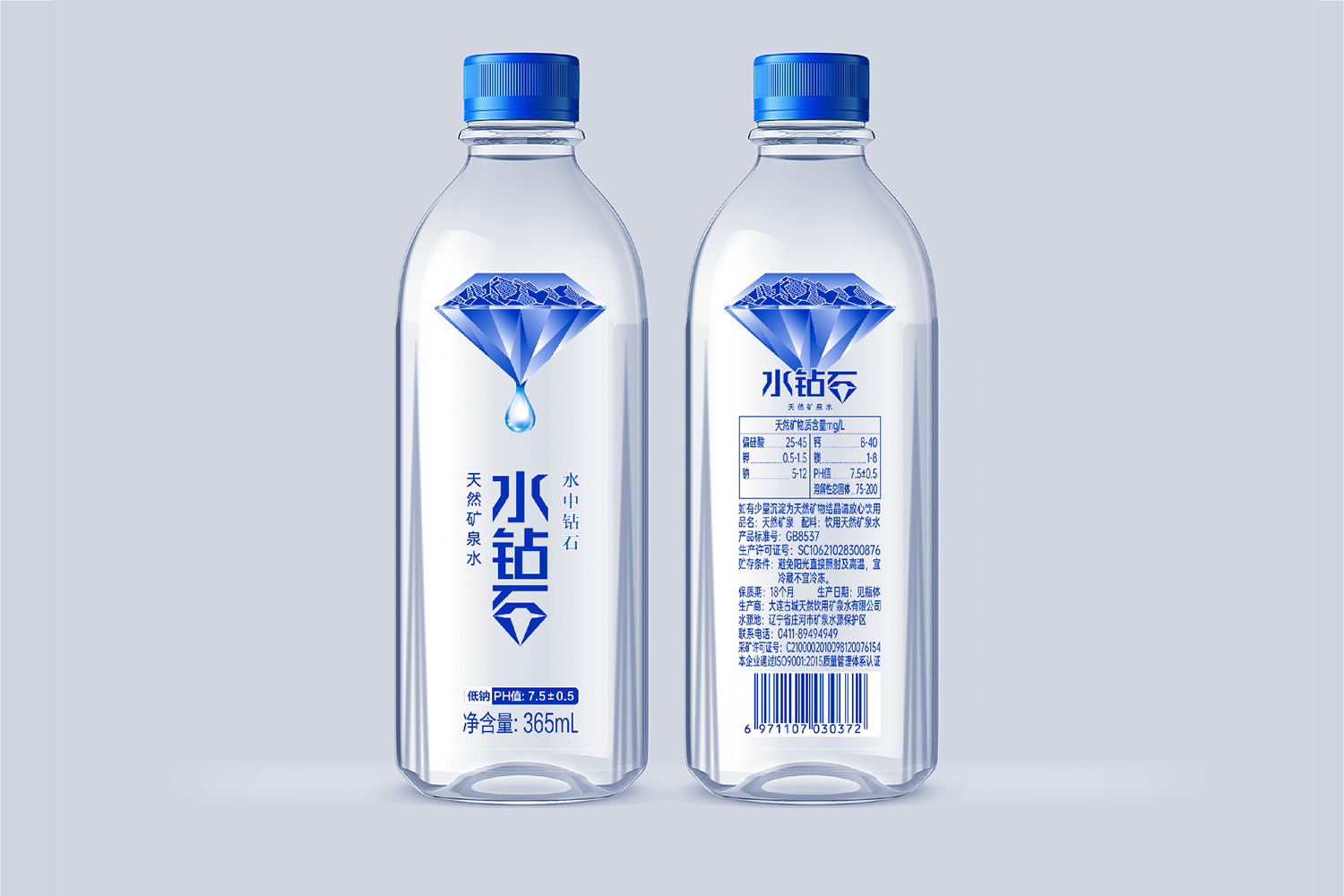 水钻石矿泉水的包装设计以简洁、大气而富有质感的视觉语言,展现了品牌的高端定位。瓶身设计分为三种样式,以满足细分市场的不同需求。