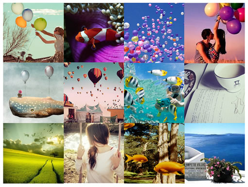 接下来通过与感性的关键词出发从生活场景中去寻找相关的图片,代表丰富,轻松,娱乐。漂浮的五彩气球,自由的鱼群,天空草地,盛放的花朵,从这些自然的生命中找到了相应的契合点,通过收集的图片,品牌组同学进行了一次头脑风暴,大家随心所欲的画下心中想象的元素和图形,一次轻松有趣的散发过程结束后再进行统一的整理和分析。