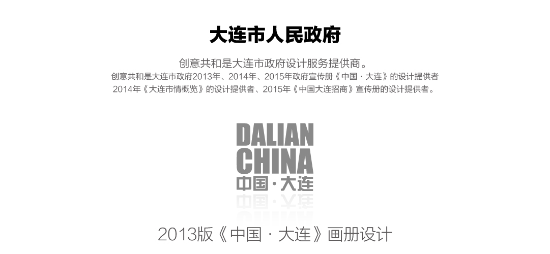 创意共和设计公司是大连市政府设计服务提供商。创意共和设计公司是2018年、2017年、2016年、2015年、2014年、2013年大连市政府宣传册《中国·大连》的设计提供者。2015年《中国大连招商》宣传册的设计提供者,2014年《大连市情概览》的设计提供者。