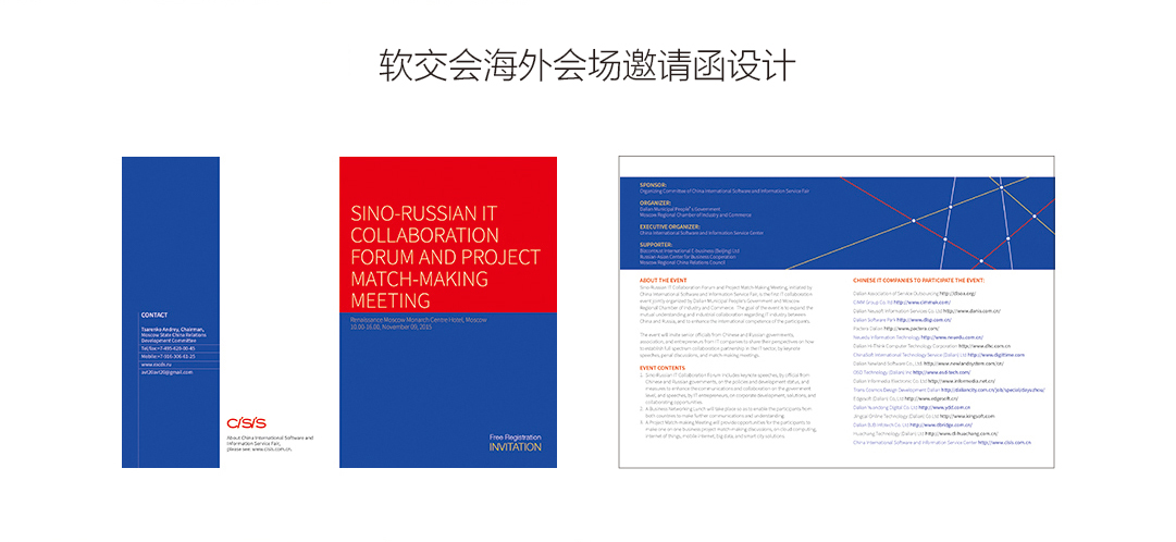 创意共和是中国国际软件和信息服务交易会(软交会)常年平面设计服务供应商(独家签订全年平面设计服务合同),历年来,软交会年度主形象都是由创意共和设计出品,并提供会议招商函、招商册、手册、海报等全部平面设计服务。