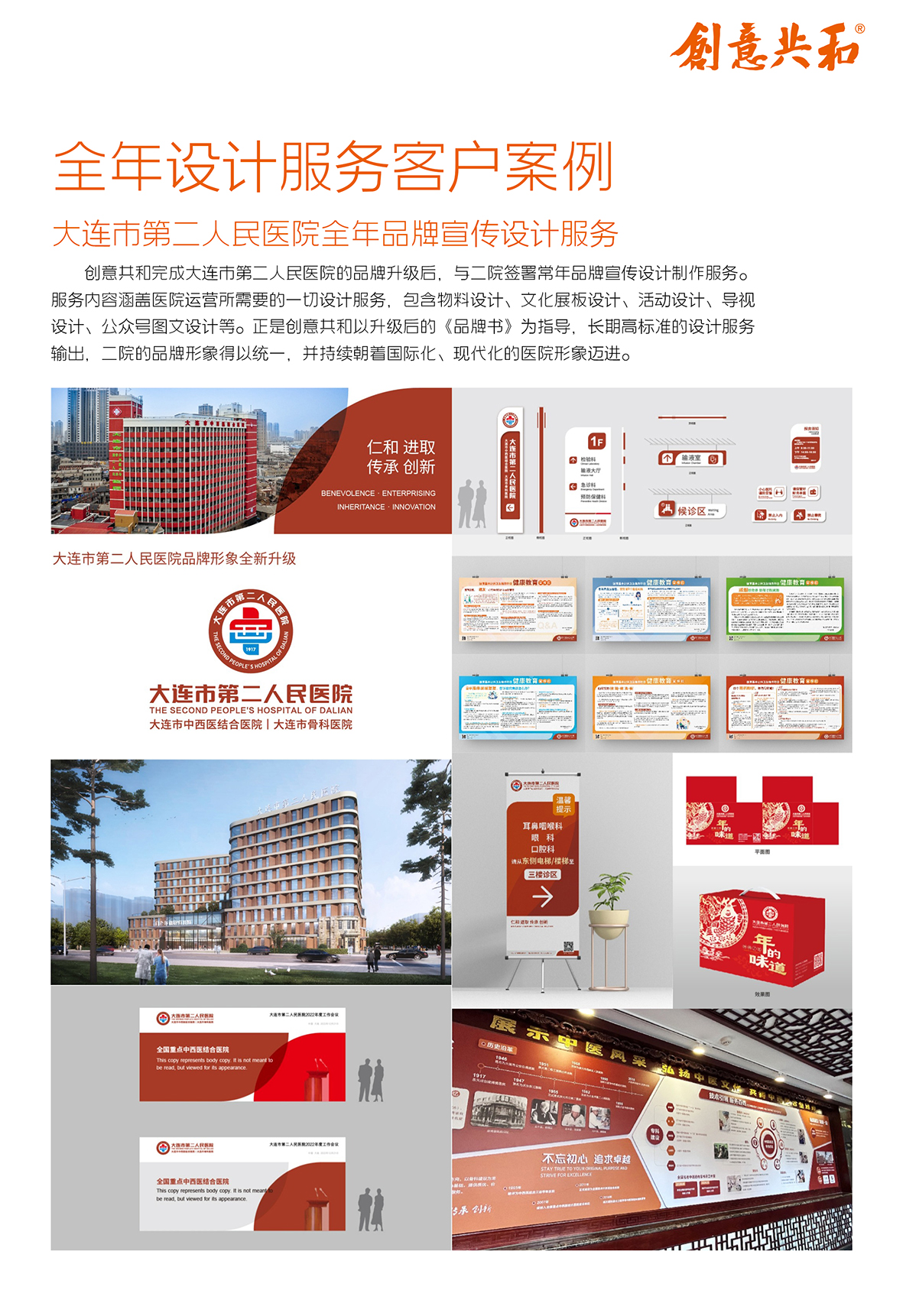 此外,创意共和还为大连市第二人民医院提供全年品牌宣传设计服务。从品牌升级到日常的物料设计、文化展板设计、活动设计等,以高标准的设计输出,助力医院统一品牌形象,朝着国际化、现代化的方向迈进。