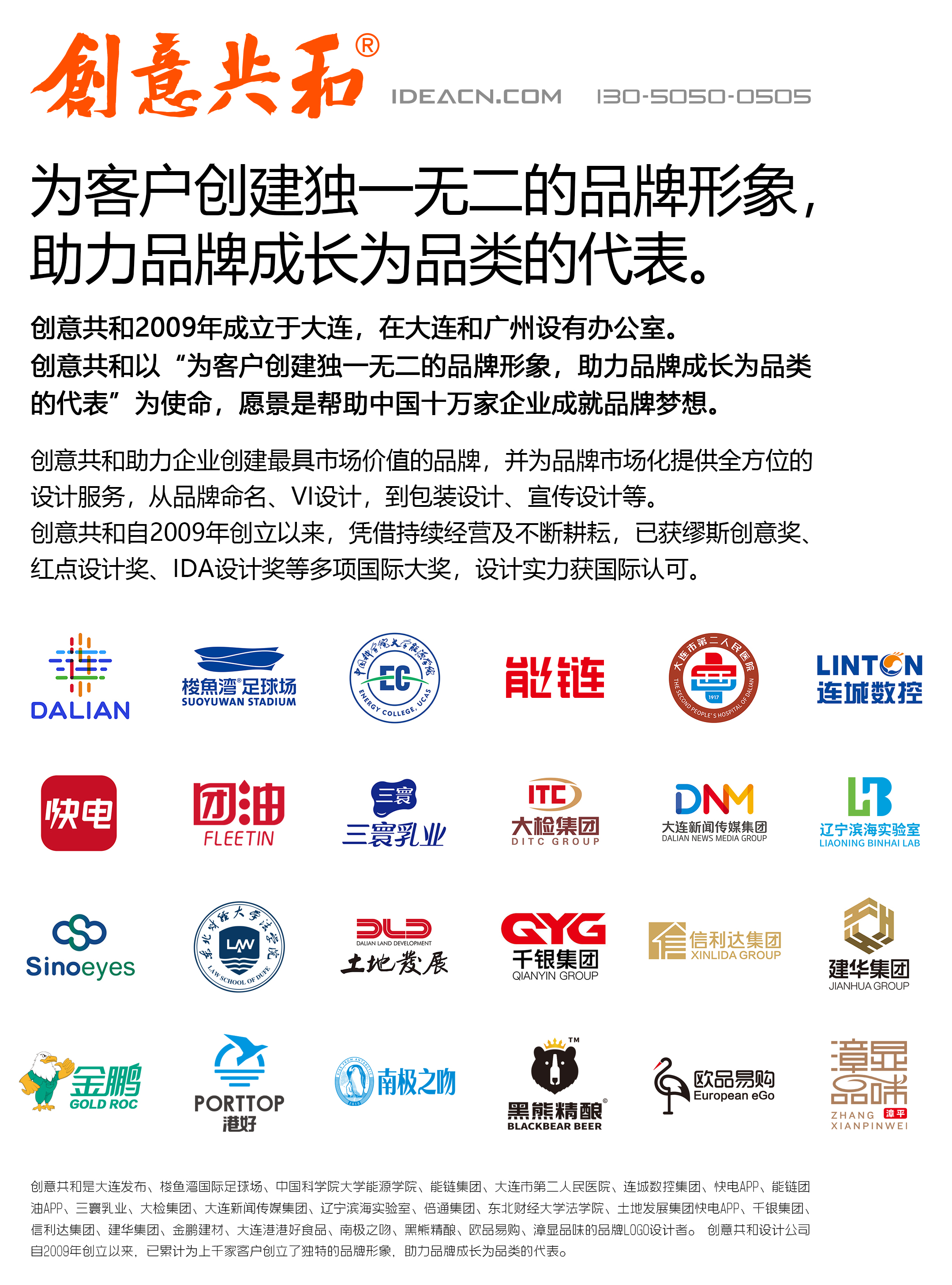 创意共和设计公司成立于2009年,总部位于大连,在广州、上海设立分支机构,形成“三地协同,服务全国”的业务格局。公司创始人团队由资深品牌设计师与策略专家组成,始终秉持“以市场为导向,以设计驱动品牌价值”的理念,为不同规模企业提供定制化服务:针对大企业组建专项设计团队,确保战略深度落地;针对中小企业推出“快标”服务,快速解决品牌命名、注册及形象设计需求。