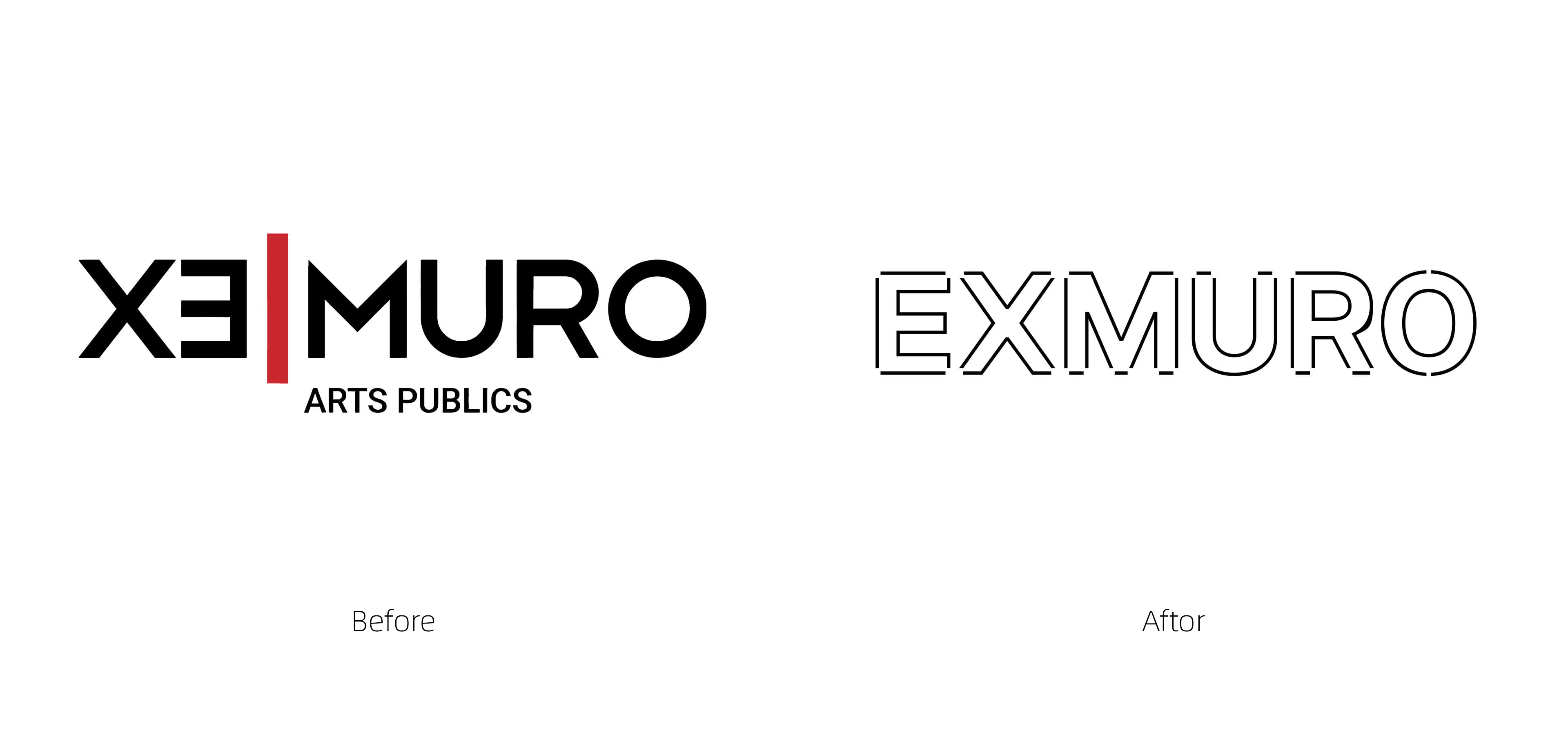 回顾EXMURO的旧版logo,其设计思路更偏向于追求视觉冲击力,而非精准传递品牌核心价值。旧logo中的字母EX采用镜像设计,中间用一条粗重的红色线条分隔,视觉上类似一面墙体,整体设计显得刻意且冗余。这种过度强调形式感的设计,未能有效展现EXMURO作为非营利组织,希望通过艺术连接城市与公众的核心宗旨。