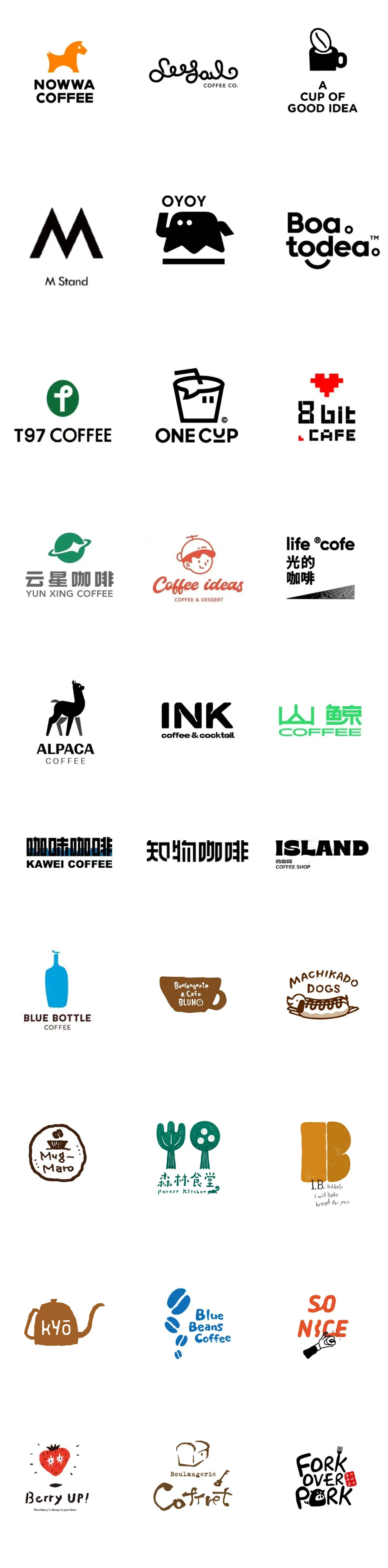 NOWWA COFFEE :橙色小马搭配文字 Logo;Seesaw Coffee Co. :手写风格文字 Logo;A CUP OF GOOD IDEA :咖啡杯 + 咖啡豆简约 Logo;M Stand :字母 M 简约 Logo;OYOY :黑色机器人造型 Logo;Boa todea :艺术字体 Logo;T97 COFFEE :绿色圆形 + 字母 P Logo;ONE CUP :简约咖啡杯线条 Logo;8 bit CAFE :像素爱心 + 文字 Logo;云星咖啡(YUN XING COFFEE) :绿色星球图案 Logo;Coffee ideas :戴帽人物 + 文字 Logo;life cofe 光的咖啡 :简约文字 + 图案 Logo;ALPACA COFFEE :羊驼剪影 Logo;INK coffee & cocktail :字母 INK 简约 Logo;山鲸咖啡(山鲸 COFFEE ) :绿色文字组合 Logo;;咖味咖啡(KAWEI COFFEE ) :黑色艺术字体 Logo;知物咖啡 :黑色简约文字 Logo;ISLAND COFFEE SHOP :黑色字母 Logo;BLUE BOTTLE COFFEE :蓝色瓶子造型 Logo;Boulangerie & Cafe BLUNO :咖啡杯文字 Logo;MACHIKADO DOGS :小狗 + 热狗图案 Logo;Mug-Maro :咖啡杯圆形文字 Logo;森林食堂(Forest Kitchen ) :仙人掌蘑菇图案 Logo;I.B.bakery :字母 B 艺术 Logo;kyo :棕色茶壶造型 Logo;Blue Beans Coffee :蓝色咖啡豆图案 Logo;SO NICE :文字 + 手势图案 Logo;Berry UP! :草莓图案文字 Logo;Boulangerie Coffret :手写风格文字 Logo;FORK OVER PORK :创意文字图案 Logo