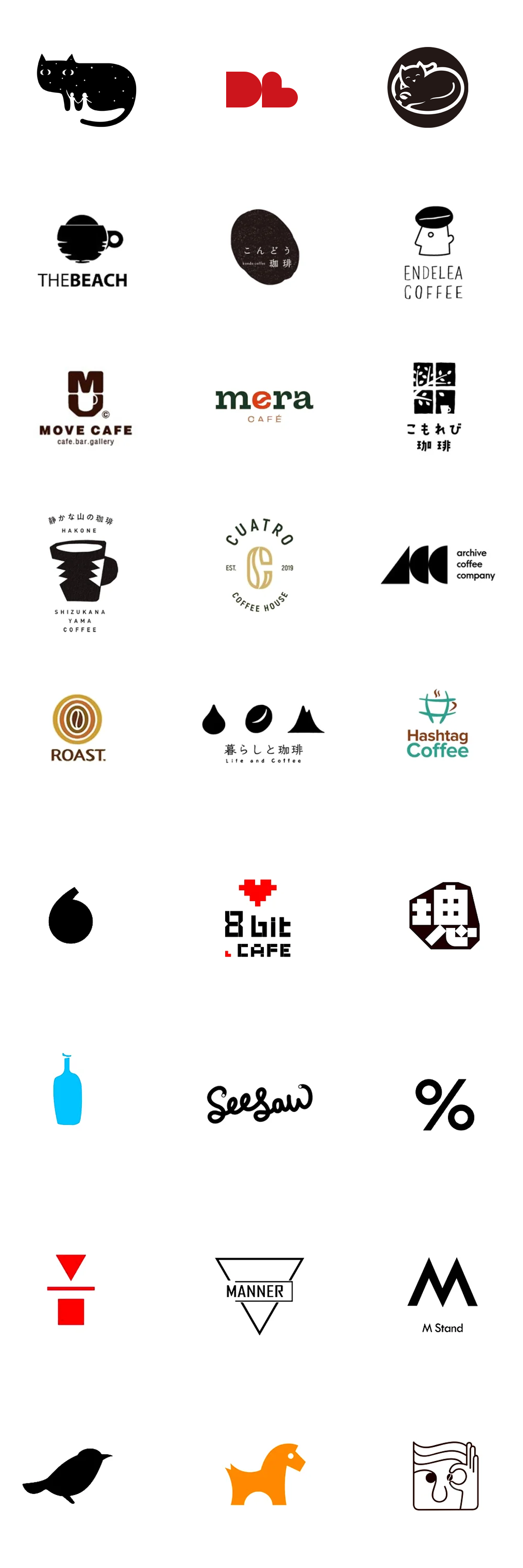 黑猫剪影风格 Logo 、 红色艺术字体 Logo 、 蜷猫圆形 Logo 、 简约咖啡杯 Logo(THEBEACH) 、 咖啡豆造型 Logo(こんどう珈琲 ) 、 戴帽人物头像 Logo(ENDELEA COFFEE) 、 字母 M 融合咖啡杯 Logo(MOVE CAFE) 、 字母 mera 多彩 Logo(mera CAFE) 、 日式方块图案 Logo(こもれび珈琲 ) 、 艺术咖啡杯 Logo(静かな山の珈琲 HAKONE ) 、 环形文字 + 字母 C Logo(CUATRO COFFEE HOUSE) 、 几何图形组合 Logo(archive coffee company ) 、 圆环咖啡豆 Logo(ROAST. ) 、 水滴、咖啡豆、山峰组合 Logo(暮らしと珈琲 ) 、 创意咖啡杯线条 Logo(Hashtag Coffee ) 、 黑色水滴形 Logo 、 像素爱心 + 文字 Logo(8 bit CAFE ) 、 汉字 “塊” 艺术 Logo 、 蓝色瓶子造型 Logo 、 手写风格 Logo(Seesaw ) 、 百分号简约 Logo(% ) 、 红三角与红方块组合 Logo 、 三角框文字 Logo(MANNER ) 、 字母 M 简约 Logo(M Stand ) 、 黑色小鸟 Logo 、 橙色小马 Logo 、 线条人脸图案 Logo