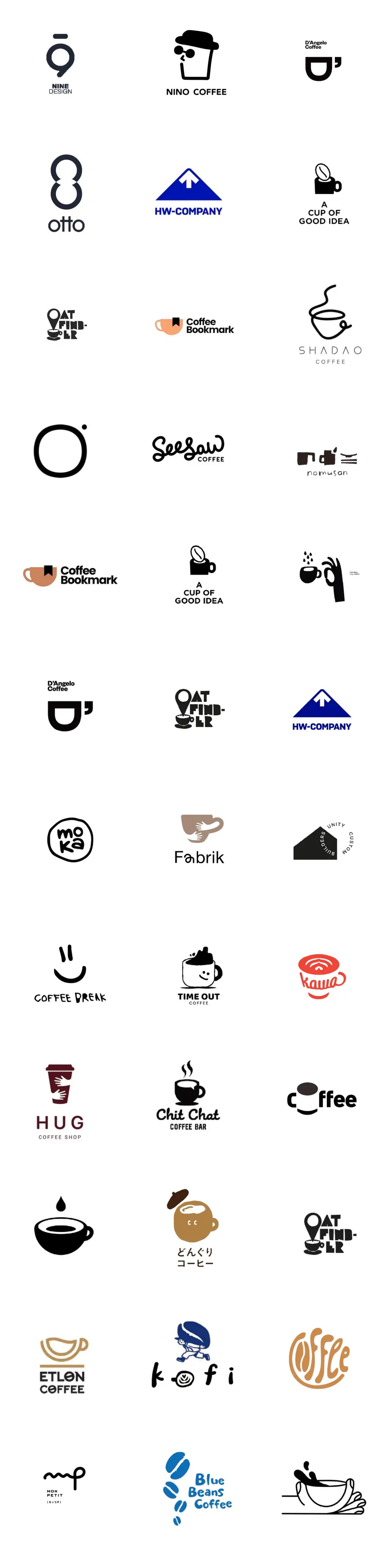 NINE DESIGN :简约几何图形 Logo;NINO COFFEE :咖啡杯剪影 Logo;D'Angelo Coffee :简约字母 Logo;otto :数字 8 变形 Logo;HW-COMPANY :蓝色三角形箭头 Logo;A CUP OF GOOD IDEA :咖啡杯 + 咖啡豆 Logo;OAT FIND-LR :地图标记 + 咖啡杯 Logo;Coffee Bookmark :咖啡杯书签造型 Logo;SHADAO COFFEE :咖啡杯线条 Logo;简约圆圈 Logo 、 Seesaw COFFEE :手写风格文字 Logo;nomusan :简约图案文字 Logo;Coffee Bookmark :咖啡杯书签造型 Logo(重复出现,风格一致 );A CUP OF GOOD IDEA :咖啡杯 + 咖啡豆 Logo;创意咖啡杯手图案 Logo 、 D'Angelo Coffee :简约字母 Logo;OAT FIND-LR :地图标记 + 咖啡杯 Logo;HW-COMPANY :蓝色三角形箭头 Logo;mo ka :字母组合圆形 Logo;Fabrik :咖啡杯 + 手图案 Logo;简约几何图形 Logo(UNITY CUSTOM BUILDERS 相关 ) 、 COFFEE BREAK :笑脸文字 Logo;TIME OUT COFFEE :咖啡杯笑脸 Logo;Kawu :红色艺术字体 Logo;HUG COFFEE SHOP :咖啡杯 + 手图案 Logo;Chit Chat COFFEE BAR :咖啡杯文字 Logo;创意字母咖啡杯 Logo 、 简约咖啡杯水滴 Logo 、 日式文字咖啡杯 Logo(どんぐりコーヒー ) 、 OAT FIND-LR :地图标记 + 咖啡杯 Logo;ETLON COFFEE :咖啡杯文字 Logo;kofi :字母 + 图案 Logo;艺术字体咖啡杯 Logo 、 mon petit :手写风格文字 Logo;Blue Beans Coffee :蓝色咖啡豆图案 Logo;简约咖啡杯泼墨图案 Logo
