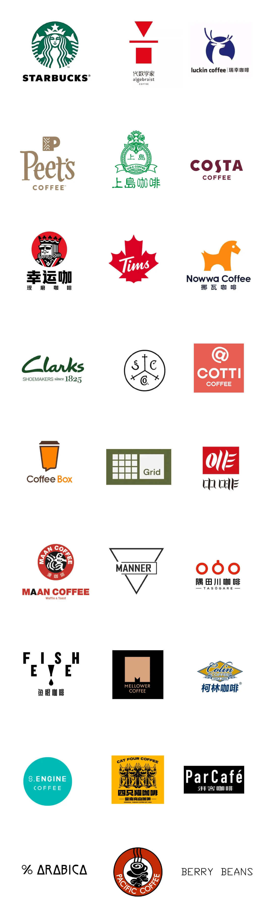 STARBUCKS(星巴克) :经典美人鱼 Logo;代数学家(algebraist coffee ) :红三角方块组合 Logo;luckin coffee(瑞幸咖啡) :蓝底鹿头 Logo;Peet's COFFEE(皮爷咖啡) :字母 P 融合文字 Logo;上岛咖啡(上島珈琲 ) :绿色徽章文字 Logo;COSTA COFFEE :紫色字母 Logo;幸运咖(现磨咖啡 ) :红色皇冠人物 Logo;Tims :红色枫叶文字 Logo;Nowwa Coffee(挪瓦咖啡) :橙色小马 Logo;Clarks(非咖啡主营,按图列 ) :绿色文字 Logo;简约几何字母 Logo(图中对应 ) 、 COTTI COFFEE(库迪咖啡) :橙色方形 @字母 Logo;Coffee Box :橙色咖啡杯对话框 Logo;Grid :绿底方格文字 Logo;OLE 中咖 :红色字母文字 Logo;MAAN COFFEE(漫咖啡) :红色圆形文字 Logo;MANNER :三角框文字 Logo;隅田川咖啡(TASOGARE ) :三个圆圈文字 Logo;FISH EYE 鱼眼咖啡 :黑色艺术字体 Logo;MELLOWER COFFEE :黑底简约图案 Logo;柯林咖啡(Colin COFFEE ) :蓝色徽章文字 Logo;S.ENGINE COFFEE(鹰集咖啡) :蓝底文字 Logo;四只猫咖啡(CAT FOUR COFFEE ) :黄底猫咪图案 Logo;ParCafé 湃客咖啡 :黑色文字 Logo;% ARABICA :百分号简约 Logo;PACIFIC COFFEE(太平洋咖啡) :红色圆形咖啡杯 Logo;BERRY BEANS :简约文字 Logo