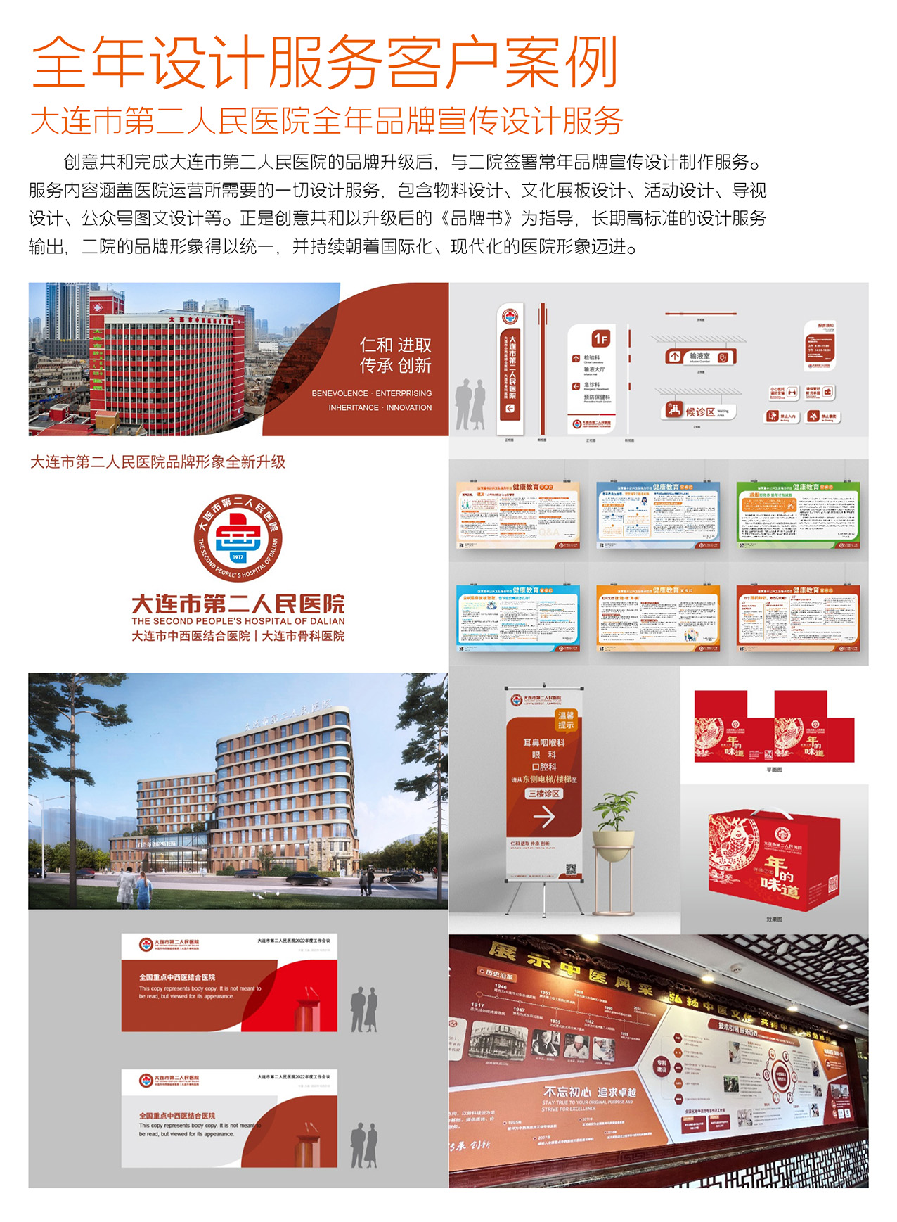 在市场落地阶段,创意共和推出年度全案托管模式,为企业构建品牌视觉的生长体系。围绕产品包装、网络 UI、会议路演、平面物料四大核心场景,提供全周期设计服务 —— 例如为大连市第二人民医院提供的全年设计服务,涵盖医院运营所需的物料设计、文化展板设计、活动设计、导视设计、公众号图文设计等,以升级后的品牌书为指导,确保医院在日常运营、学术交流等场景中保持形象一致性,助力医院向国际化、现代化方向迈进;为东北财经大学管理科学与工程学院 40 周年院庆提供的全流程设计,贴合学院学科优势,通过色彩分区与异形展板设计,将学术底蕴与创新活力融入空间视觉,实现学科特色与艺术表达的深度融合。