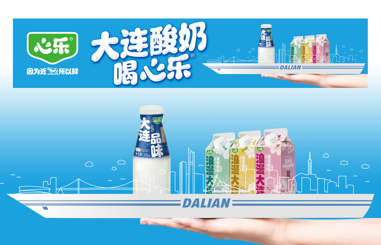 第一组户外广告采用 “手托大船” 的创新构图,船体轮廓由星海湾大桥与大连城市地标建筑剪影拼接而成,心乐乳业的酸奶、巴氏奶等核心产品自然融入建筑轮廓中,形成 “产品即城市一部分” 的视觉效果。这种设计既象征心乐乳业与大连的深度绑定,又以大桥为 “连接纽带” 的意象,传递品牌 “为大连人提供新鲜乳制品” 的使命。色彩上选用清新的蓝白渐变,既呼应大连海洋城市特质,又凸显乳制品的纯净属性。