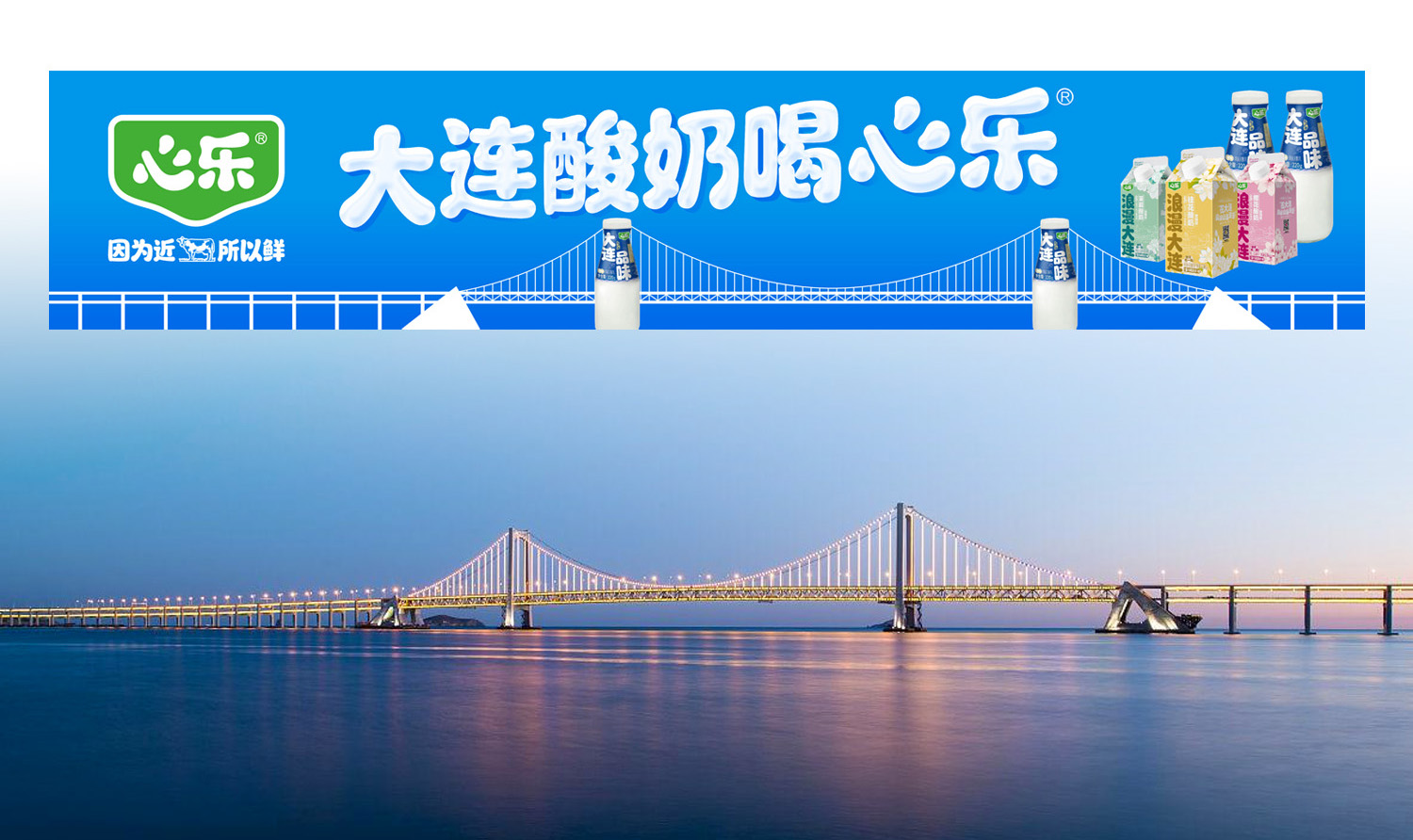 心乐乳业作为大连本土乳业领军品牌,需要通过广告设计强化 “本土品牌 + 健康品质” 的双重认知,同时建立与大连消费者的情感连接。创意共和团队深入挖掘大连城市文化符号,将星海湾跨海大桥、东港五街大船这两大标志性景观作为设计核心元素,打造出两组极具地域辨识度的广告作品。