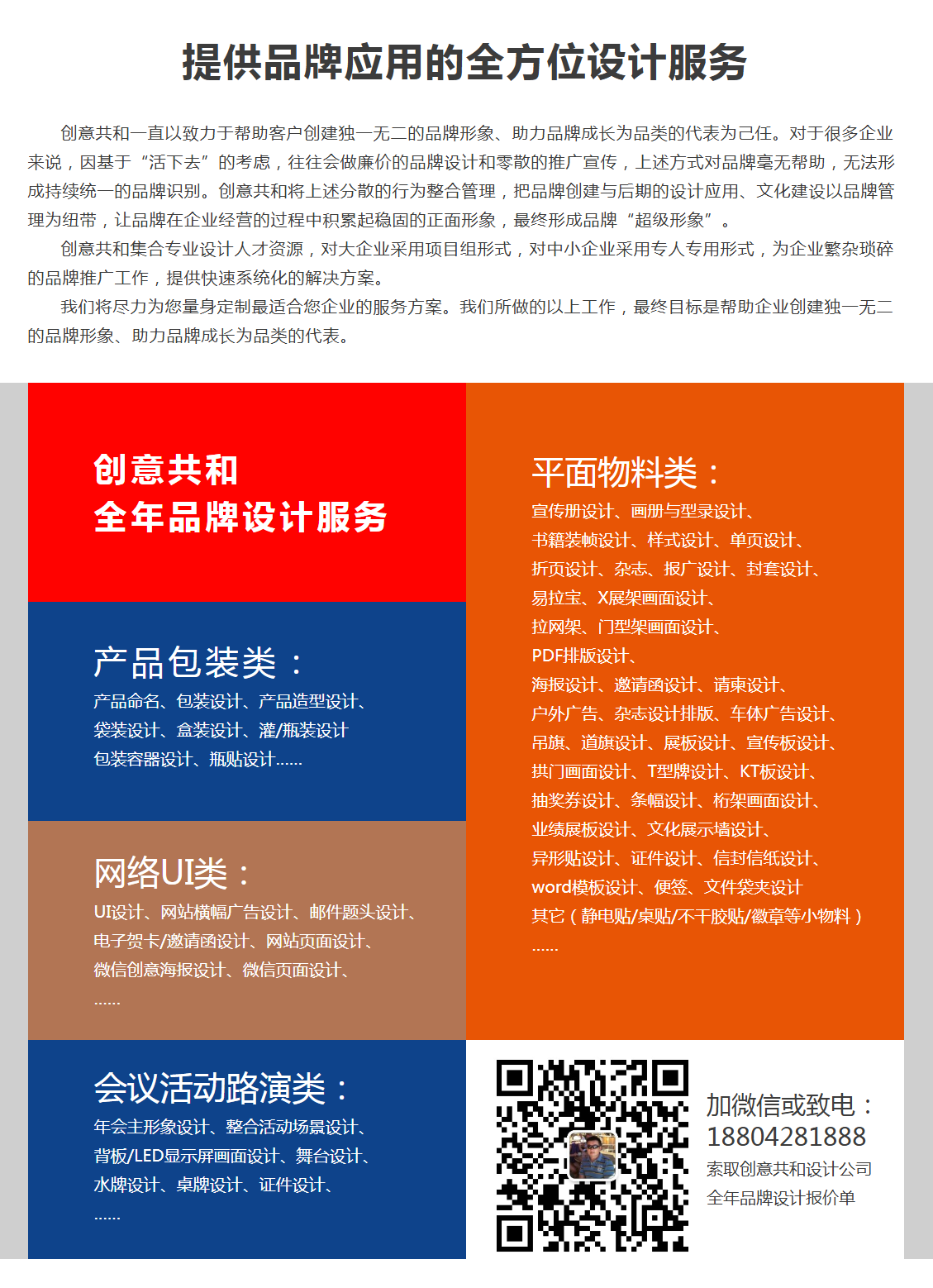 业务涵盖:商标命名、商标 LOGO 设计、商标注册、VI 设计、品牌升级设计、UI 设计、包装设计、广告设计及年度平面设计服务等