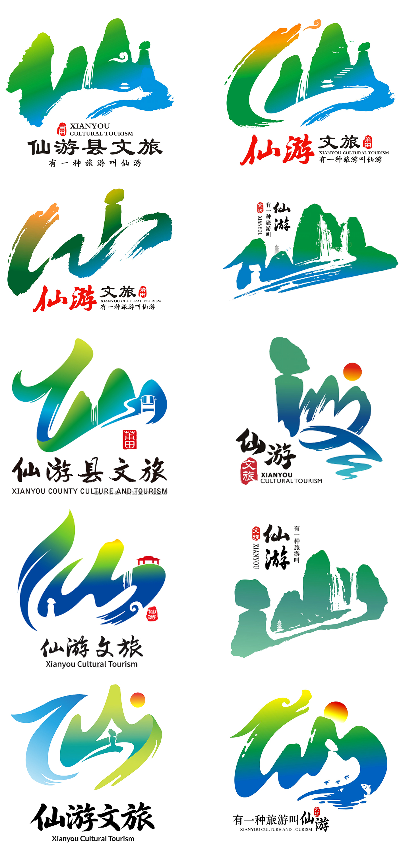其次是色彩的同质化。大部分作品都选择蓝绿色代表生态自然,搭配红色或黄色象征文化热情,这种配色组合在全国县镇文旅 LOGO 里几乎随处可见。比如仙游有作品用蓝绿色体现山水,加红黄色表现活力;还有作品直接用红黄绿蓝渐变,美其名曰展示多彩仙游,但实际上这种配色既没有地域特色,也缺乏现代设计的美感,很难在众多文旅 LOGO 中脱颖而出。