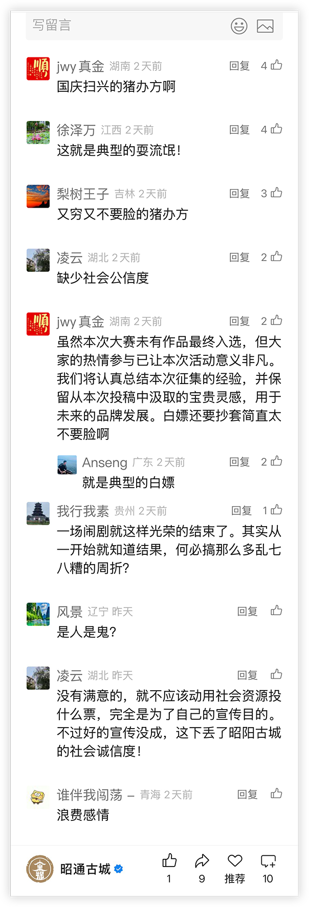 10 月 1 日,昭通古城公众号发布公告,称其口号与 Logo 征集大赛最终未甄选出唯一优胜作品。这场持续一年的征集活动,最终以 “宁缺毋滥” 的表述收尾,但网友们的质疑声浪,让活动背后的品牌公信力问题逐渐凸显。