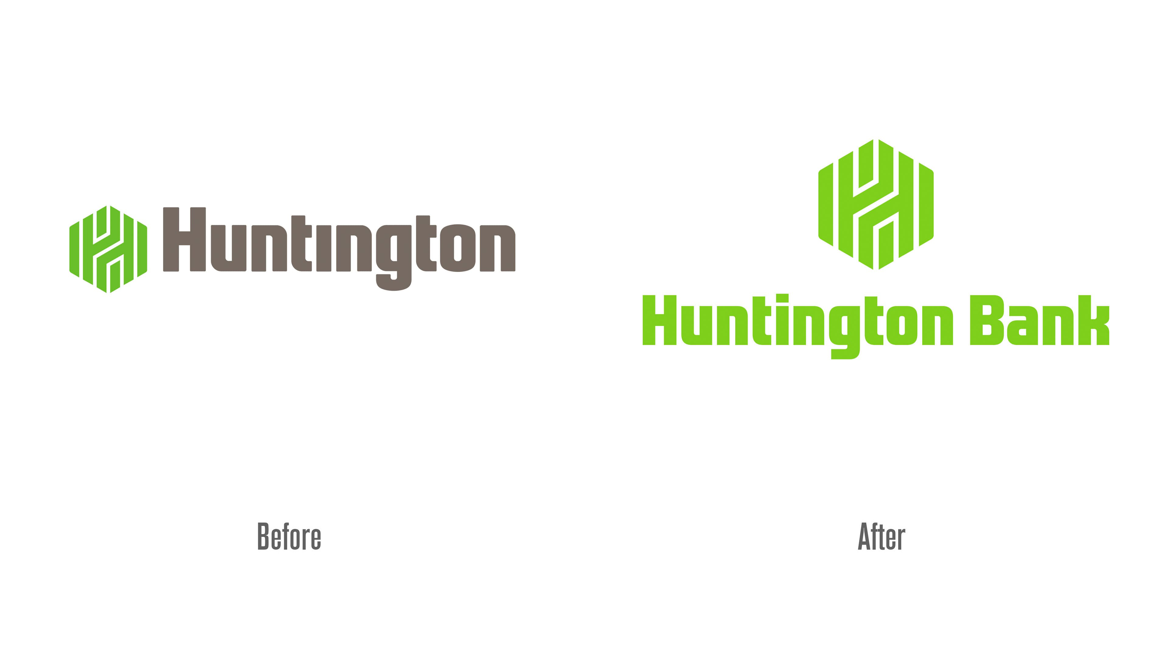 此次 LOGO 升级并未抛弃经典元素,而是在保留核心六边形符号的基础上进行优化。新 LOGO 的六边形图形更显轻盈,内部字母 H 线条变细、比例更均衡;主色调从灰绿色调整为明亮的绿色,既象征生长与更新,也为品牌注入活力;品牌名称采用现代圆润的字体,以单排形式呈现 Huntington Bank,清晰强调其银行机构属性,消除视觉歧义。