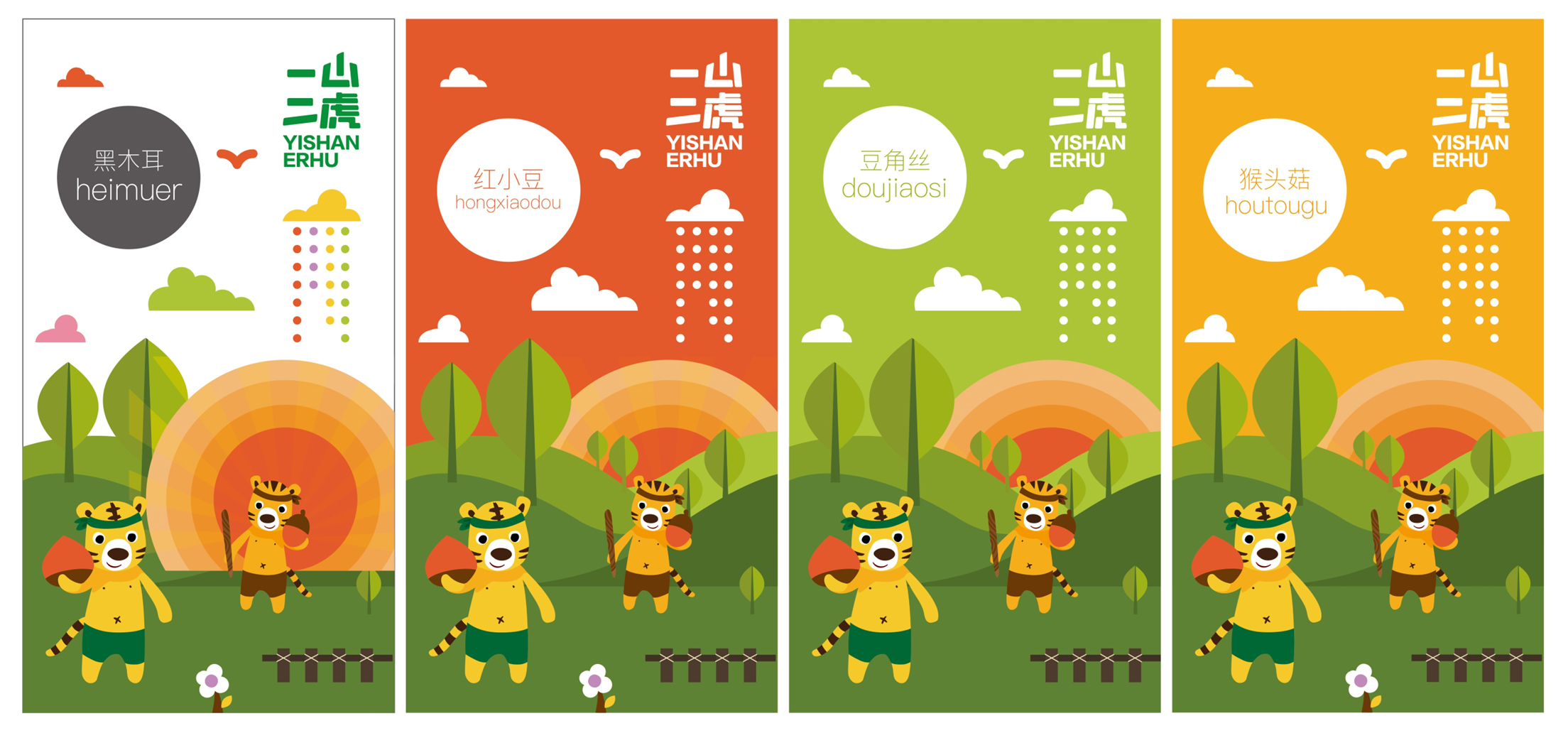 “二山二虎”是创意共和为某东北地区农产品品牌打造的全新包装体系。该品牌主打黑木耳、红小豆、豆角丝、猴头菇等山野食材,原有包装朴素无特色,难以在众多同类产品中脱颖而出。