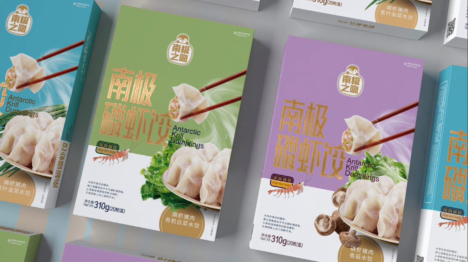 “南极磷虾饺”是一款高端冷冻食品。创意共和为其设计的包装以简约清新的蓝色为主调,突出产品的纯净与健康属性。正面采用实物图展示饺子的饱满形态,搭配精致的竹叶图案,传递出高端品质感。侧面详细标注了产品成分和食用方法,方便消费者了解。
