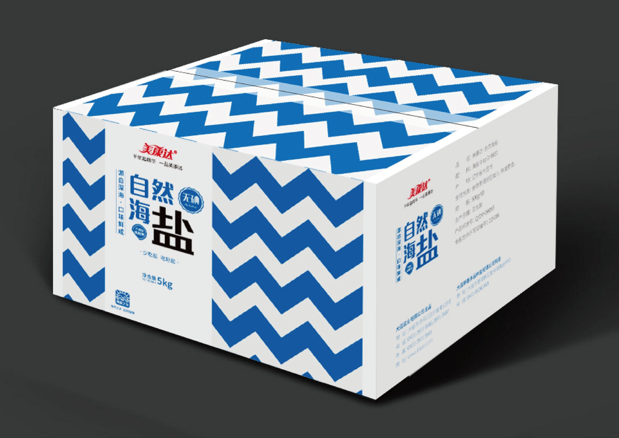 “烧盐”是一款主打健康与品质的盐产品。创意共和为其设计的包装以蓝白相间的波浪图案为主题,象征海水与自然,传递出产品的纯净与科技感。正面采用简洁的文字说明和品牌标识,背面则详细展示了产品的生产工艺和营养成分表,增强了消费者的信任感。