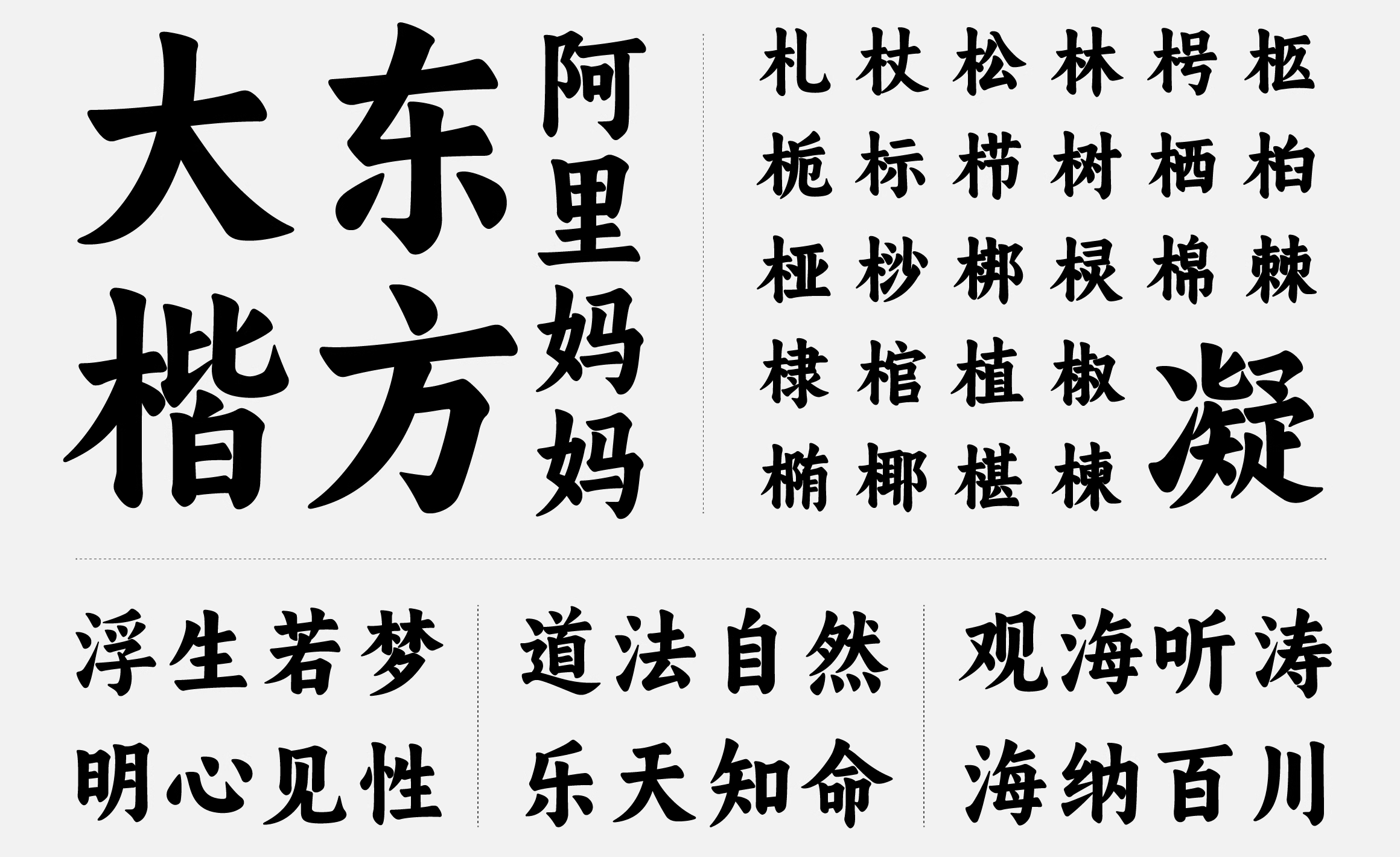 阿里妈妈东方大楷的官方下载地址(点击),以中国传统大楷书法为设计灵感。字体笔画饱满浑厚,笔法精湛细腻,尽显毛笔书法的韵味与气势,风格庄重典雅,兼具艺术感与文化底蕴。字符收录齐全,能满足传统风格设计的中文使用需求。标设网认为,阿里妈妈东方大楷适合用于传统文化展览宣传、中式餐饮品牌包装、节日贺卡、书法类文创产品等场景,能很好地传递中国传统文化的厚重与美感。