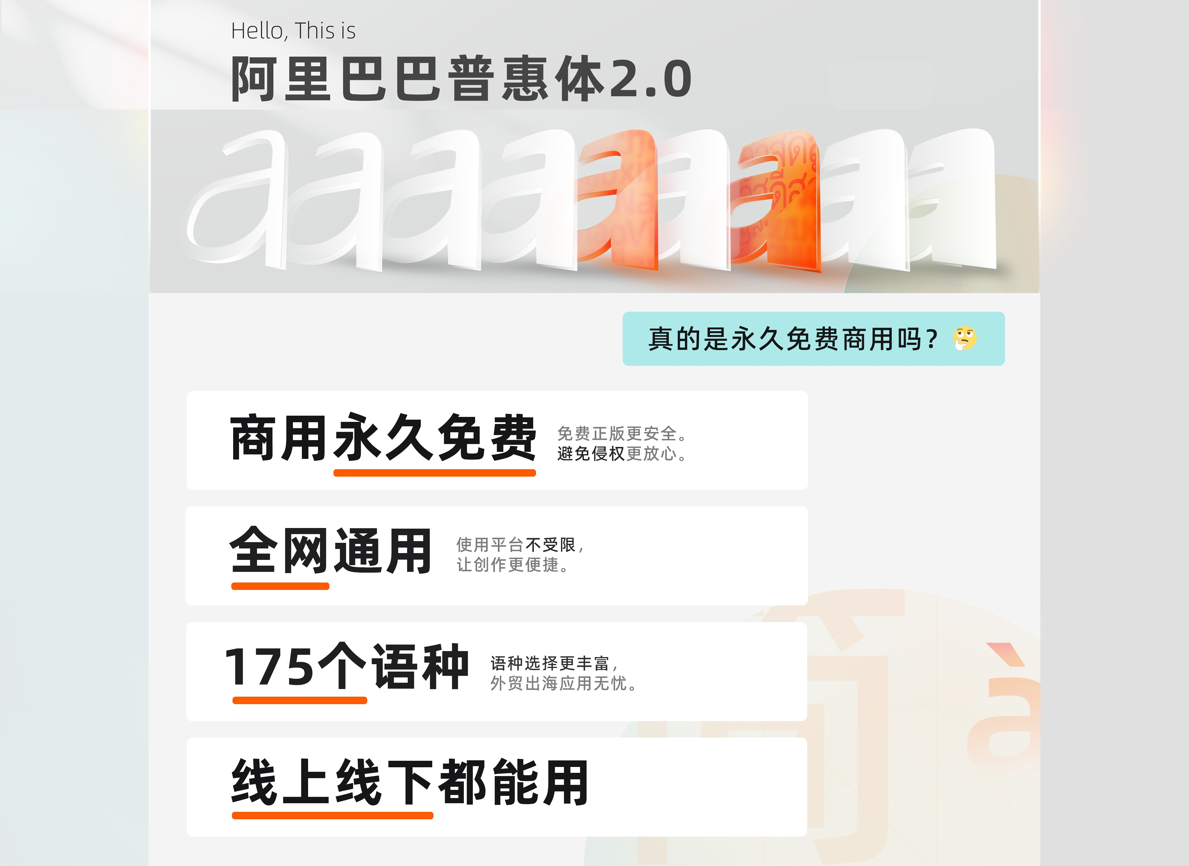 阿里巴巴普惠体 2.0的官方下载地址(点击),是一款真正意义上的全场景免费商用字体。它涵盖178个语种,字符收录极为丰富,能满足全球不同地区、不同语言的设计需求。字体设计简洁现代,兼具美观性与实用性,笔画粗细适中,结构均衡,识别度高。标设网认为,阿里巴巴普惠体 2.0适用于品牌形象设计、产品包装、广告宣传、网页APP界面、跨境电商设计等全场景,其开放的商业授权政策,为个人和企业提供了极大的便利,是商业设计中的“全能选手”。