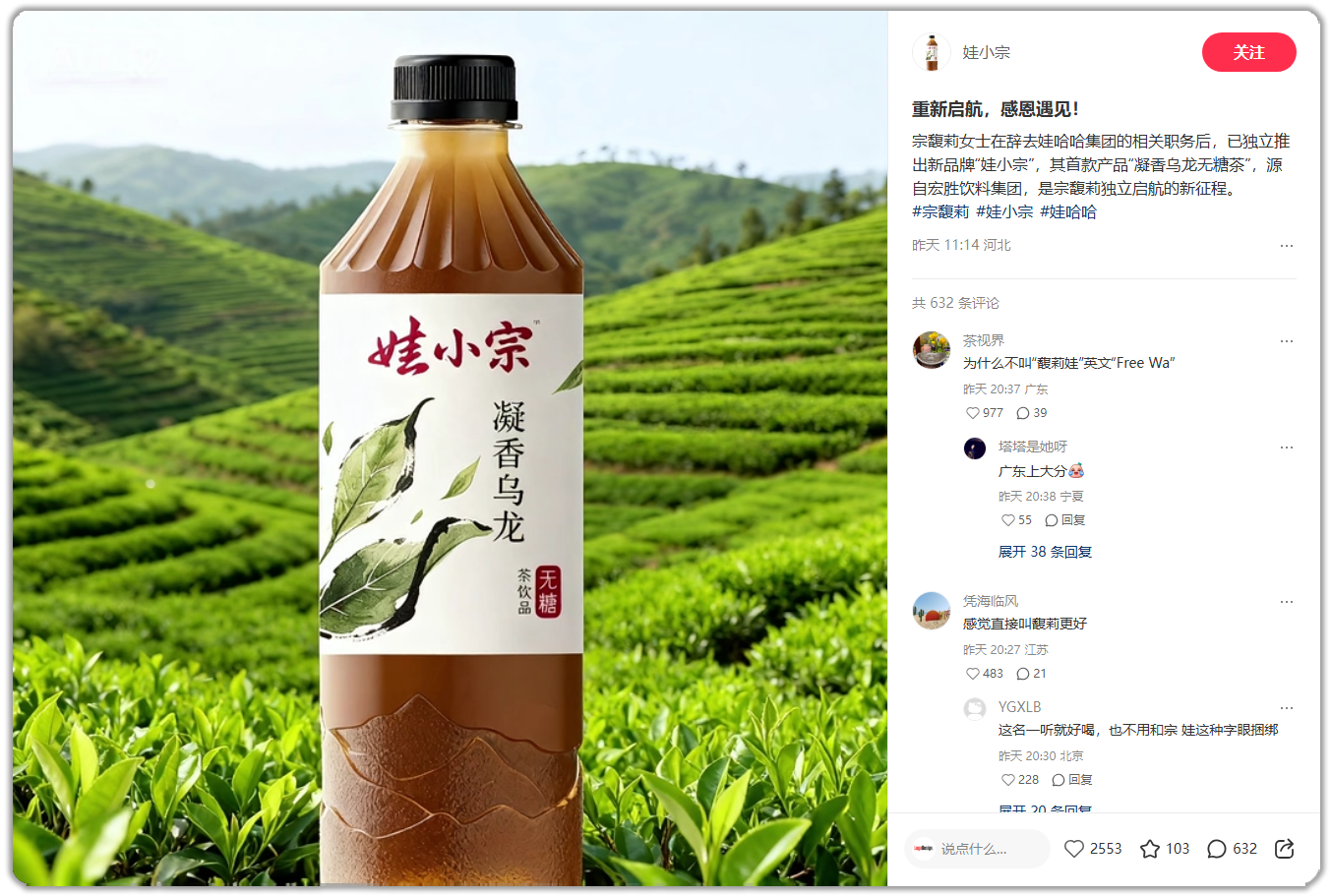 宗馥莉辞去娃哈哈集团相关职务后,其主导的新品牌娃小宗动作频频。小红书与微博官方账号的相继上线,配合首款产品凝香乌龙无糖茶的低调亮相,标志着这个脱胎于宏胜饮料集团的新品牌正式启动市场布局。但从品牌建设的核心环节来看,娃小宗在命名与设计层面暴露的问题,可能让其刚迈出第一步就陷入被动。