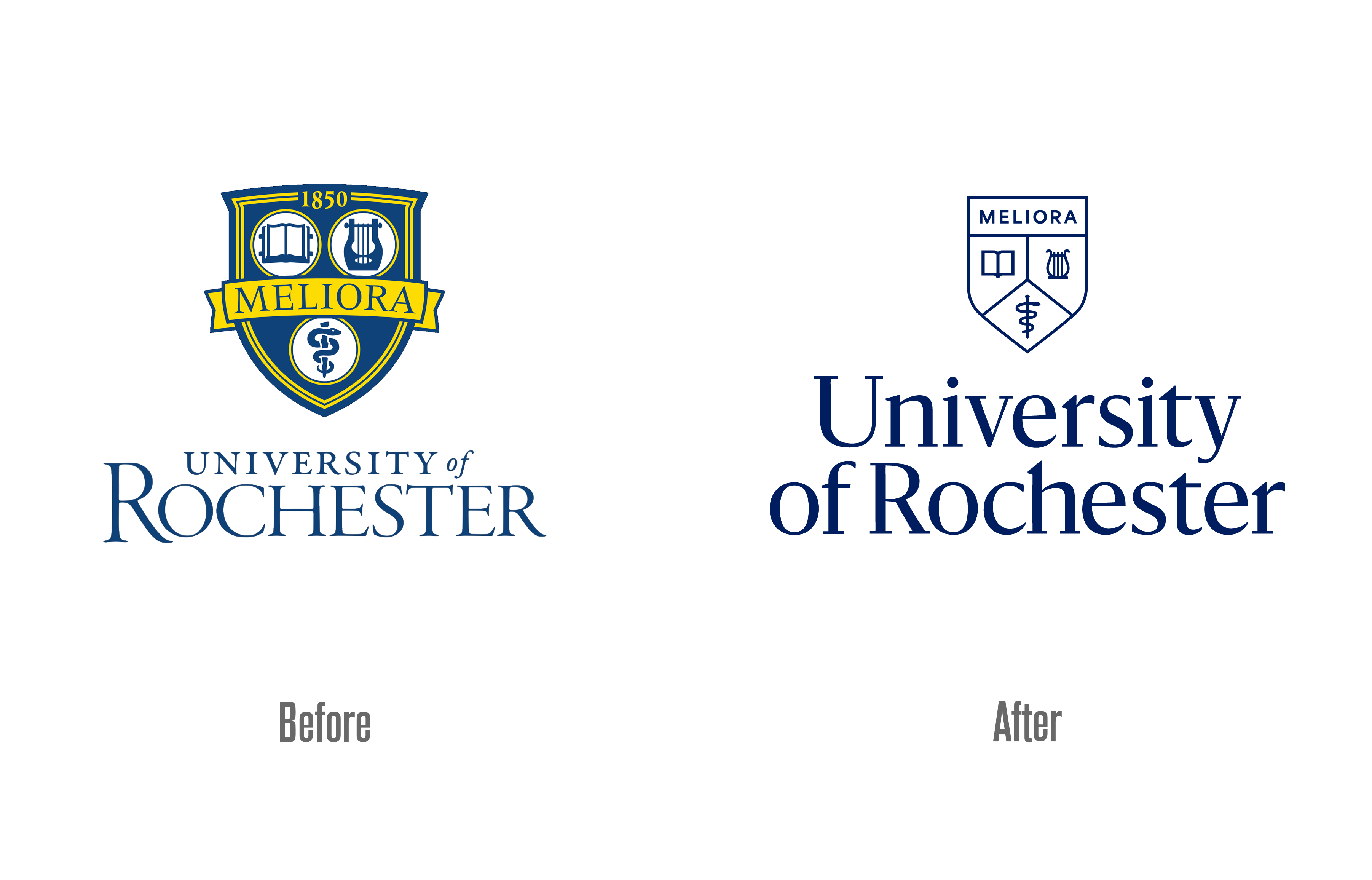 文字标识方面,旧版“University of Rochester”字体端庄而带有古典衬线,新版则采用更平衡的比例与更高可读性的新字体,使标识在网站、移动端和印刷品中都能保持统一表现。标设网认为,这种从立体感到平面化的演变,不仅体现视觉趋势的转变,也反映了罗切斯特大学品牌理念的更新——从学院象征转向数字时代的全球传播。
