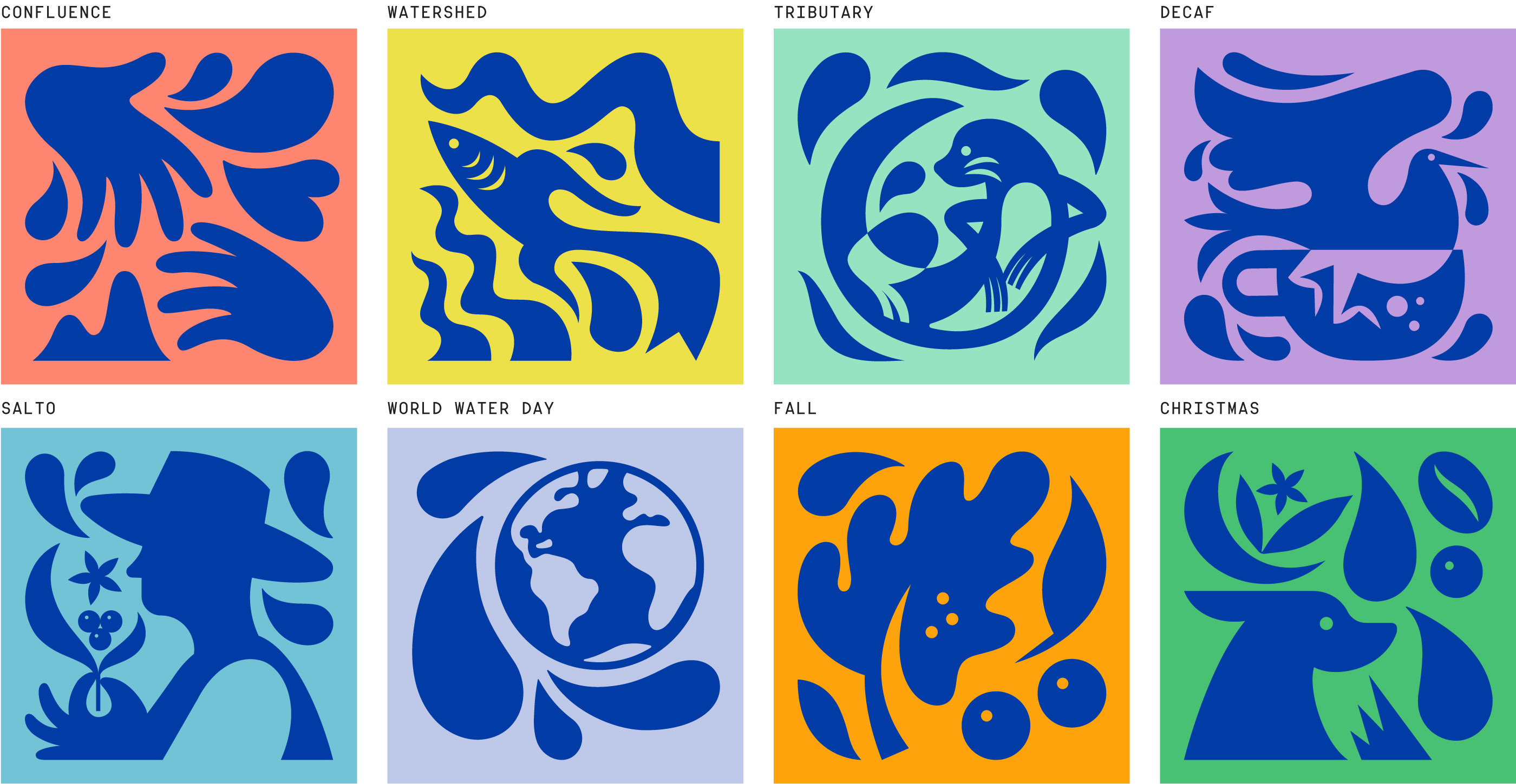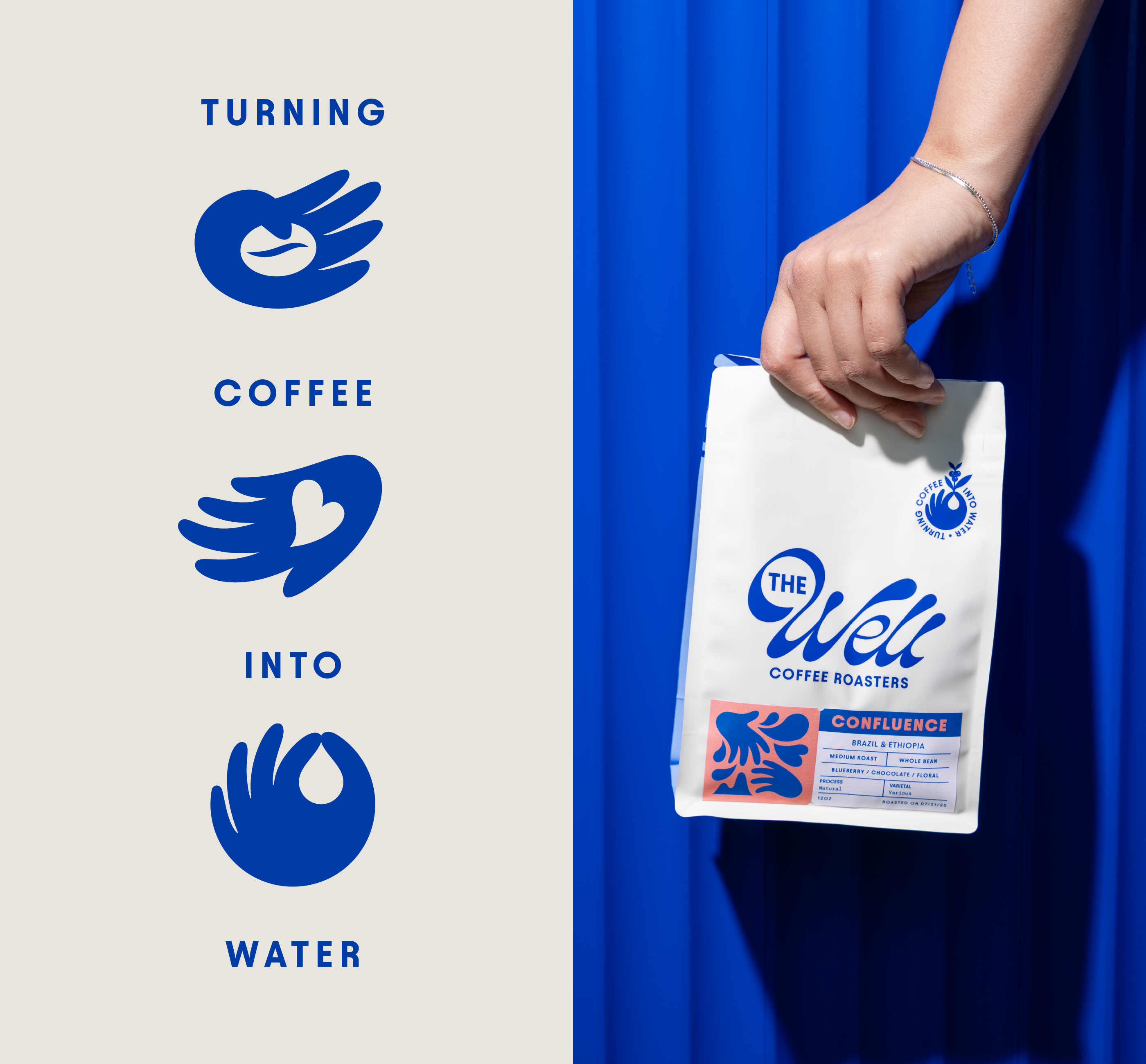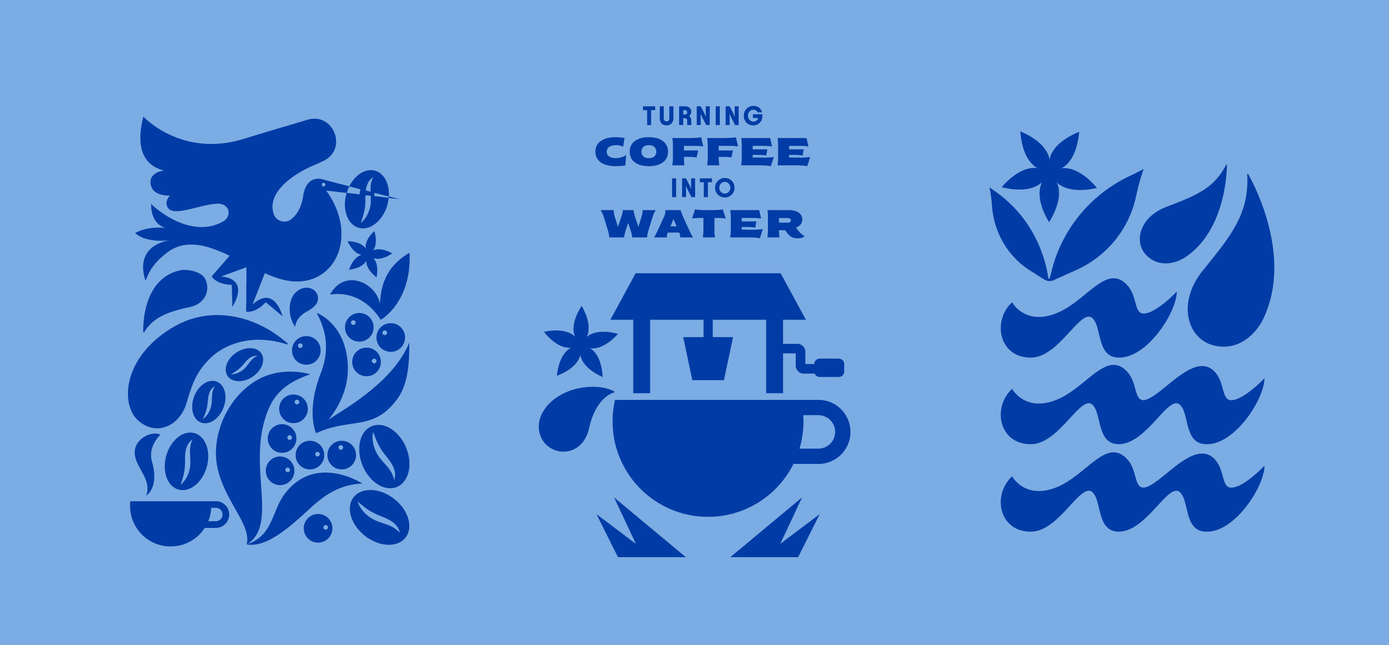 标设网认为,新视觉系统的符号设计极具融合性。涵盖水滴、豆子、手、嫩芽四类核心元素,咖啡枝逐渐转化为水滴的图案,手托嫩芽的隐喻造型,既串联起咖啡生产与净水援助的关联,也传递出关怀与连接的品牌温度。插画部分选用真实的咖啡师、农户和受助者故事,让品牌公益不再抽象。文字部分选用 Avantt Bold 字体,在柔和的流动感中加入几何结构的平衡,让视觉呈现既有人文温度,又不失规整感。