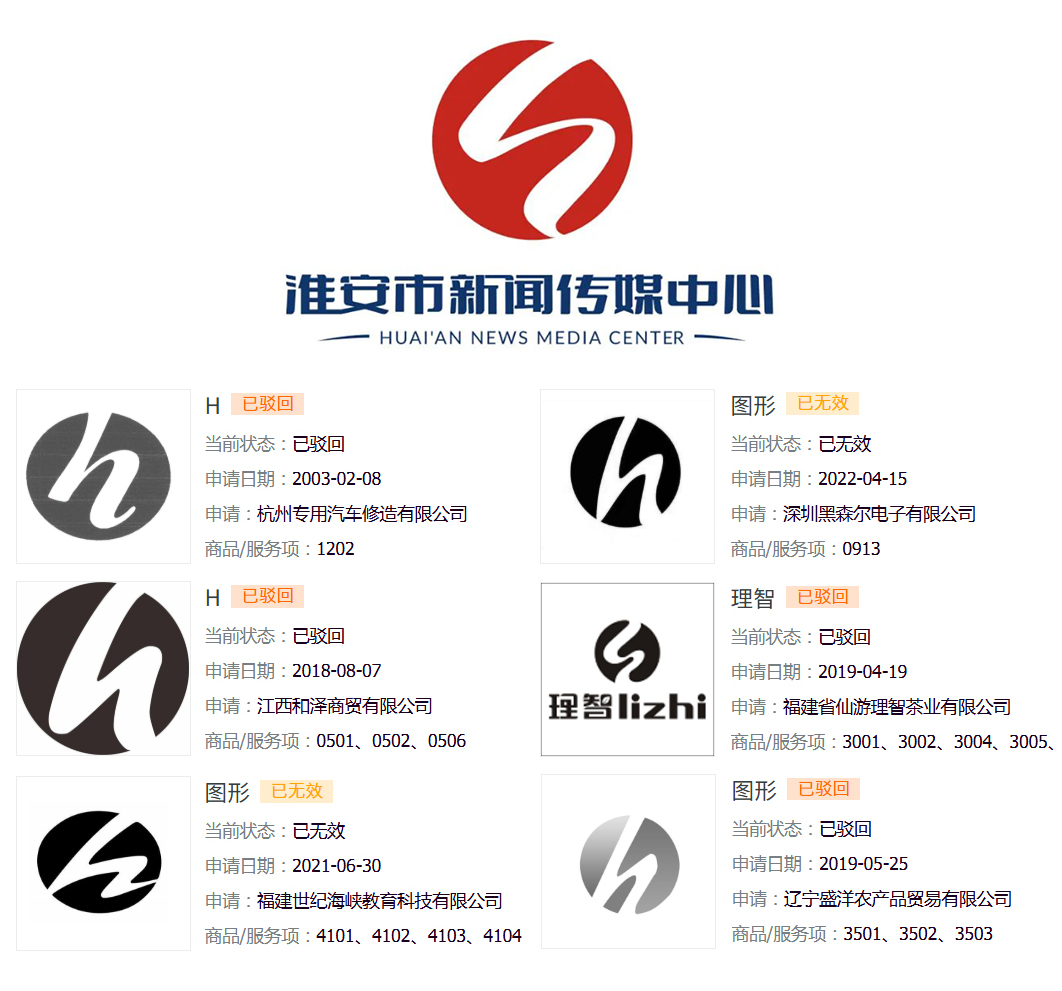 标设网对比商标数据库发现,淮安市新闻传媒中心(传媒集团)公示的采用LOGO,与商标库很多注册图形雷同,创意雷同、形式雷同,都是圆形,都用H或N在圆形内的结构。标设网发现,此类图形在国家商标局都是被驳回状态。不出意外的话,淮安市新闻传媒中心(传媒集团)这枚选用LOGO如申请商标注册,大概率不会成功,品牌建设之路可能会遇阻。