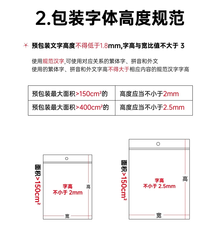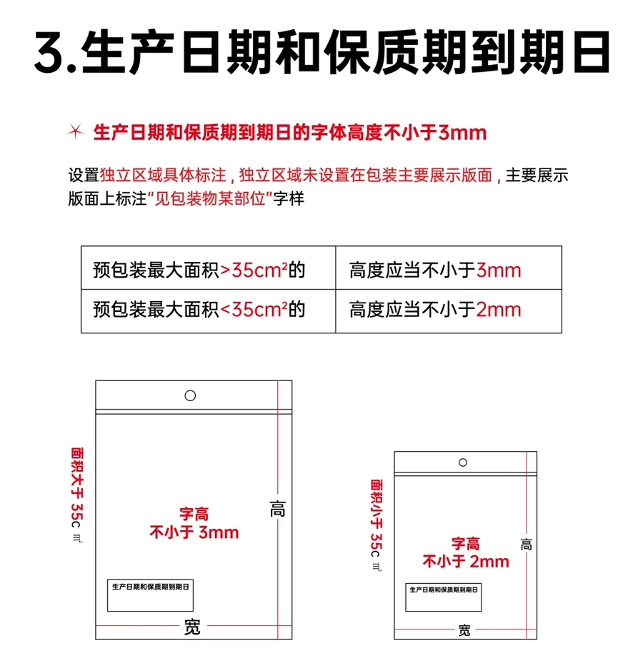 2. 包装物最大表面面积>150cm? 时文字高度≥2mm,>400cm? 时≥2.5mm;生产日期和保质期到期日字体高度:>35cm? 时≥3mm,<35cm? 时≥2mm,需设置独立区域标注,主展示版面标注 “见包装物某部位”。