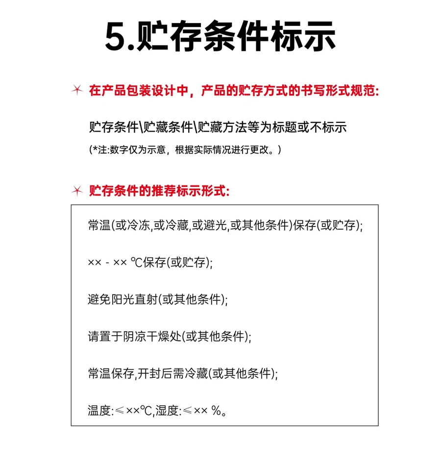 4. 贮存条件:可使用 “贮存条件”“贮藏方法” 等标题或不标示标题,推荐形式包括 “常温保存”“-18℃冷冻保存”“避免阳光直射”“温度:≤25℃,湿度:≤60%” 等,需清晰明确。