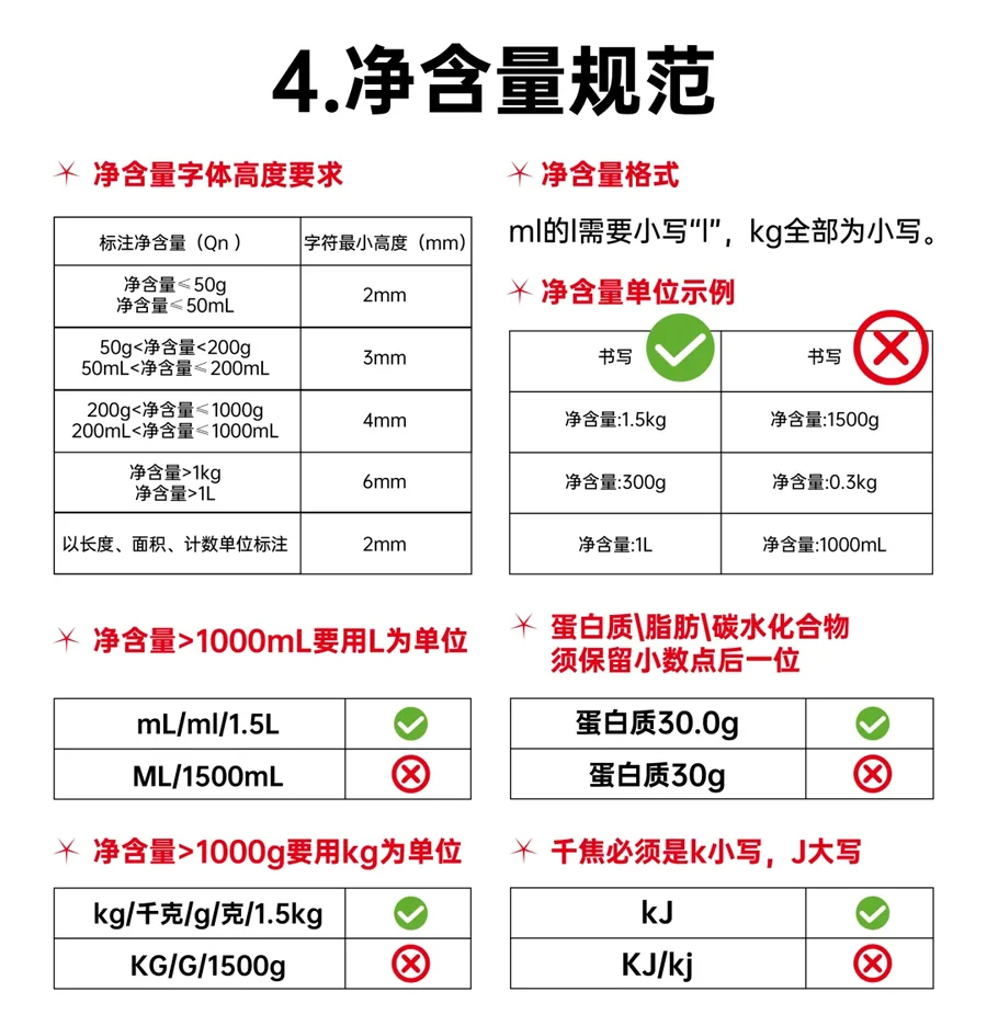 1. 净含量规范:需与食品名称在同一展示版面标示,单位标注有明确要求:ml 的 l 小写,kg 全小写;净含量>1000mL 用 L 为单位,>1000g 用 kg 为单位。字体高度需符合:≤50g/mL 为 2mm,50-200g/mL 为 3mm,200-1000g/mL 为 4mm,>1kg/L 为 6mm,长度 / 面积 / 计数单位标注为 2mm。