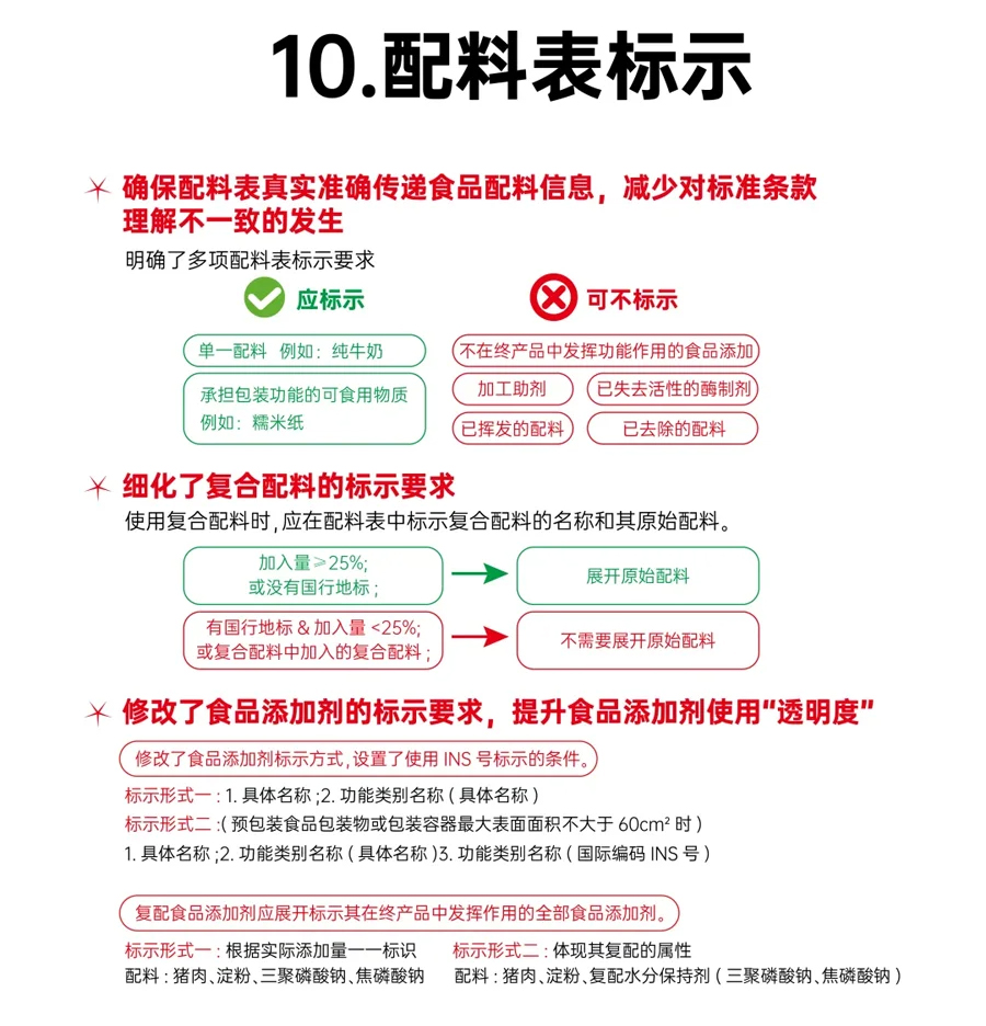 2. 复合配料标示:复合配料(非复配食品添加剂)需标示名称及原始配料(括号内按比例排列),若复合配料有国标 / 行标 / 地标且加入量<25%,可不标示原始配料;复合配料中的复合配料可不展开。