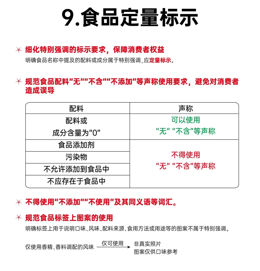 4. 定量标示要求:特别强调添加或含有某成分,或强调 “无”“不含” 某成分时,需标示具体含量;“无”“不含” 仅适用于成分含量为 0 的情况,食品添加剂、污染物等禁止使用该类表述;不得使用 “不添加”“不使用” 及其同义语。