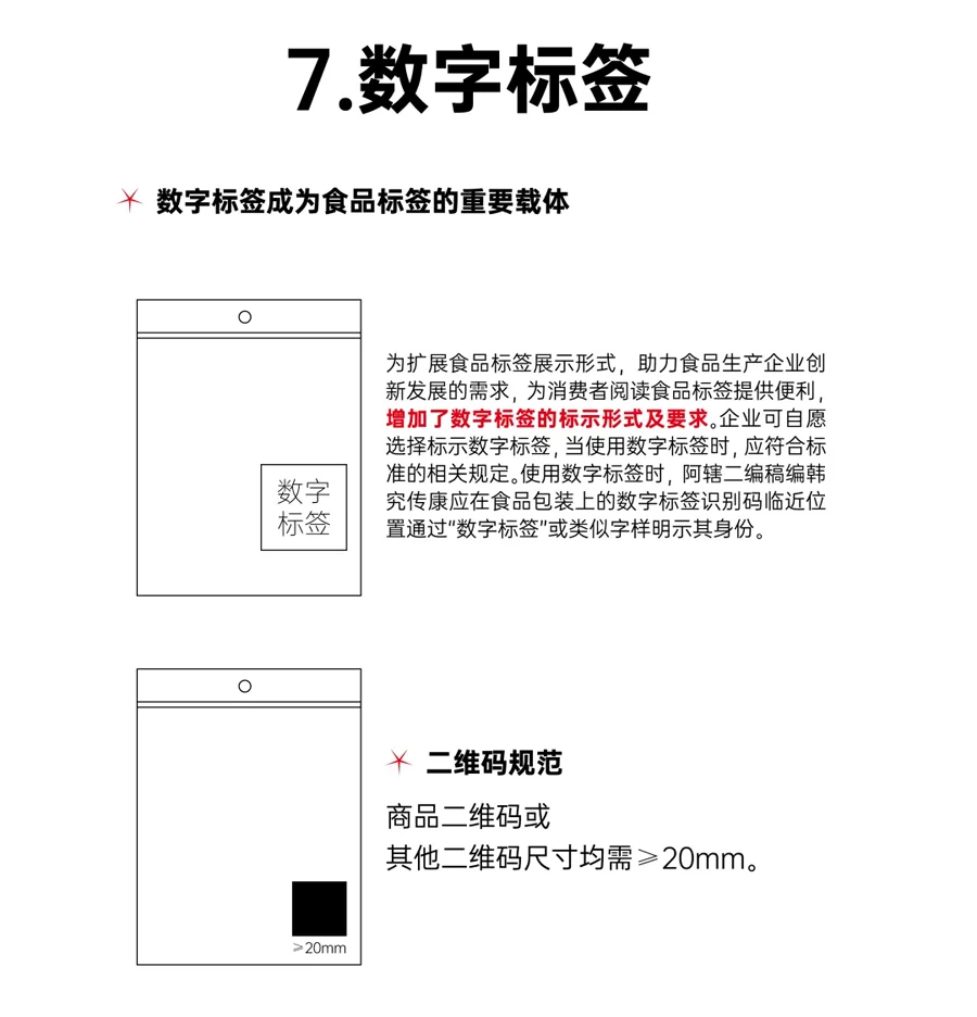 1. 数字标签:企业可自愿选用,需在识别码临近位置标注 “数字标签” 字样;二维码尺寸≥20mm,内容需与包装标签一致,识读后一级页面直接展示信息,无干扰元素,可结合视频、语音等形式。创意共和认为,数字标签的推广为包装设计提供了 “轻量化 + 多功能” 的创新方向,设计师可通过二维码整合生产追溯、食用指南等复杂信息,简化传统版面的同时提升消费者体验。