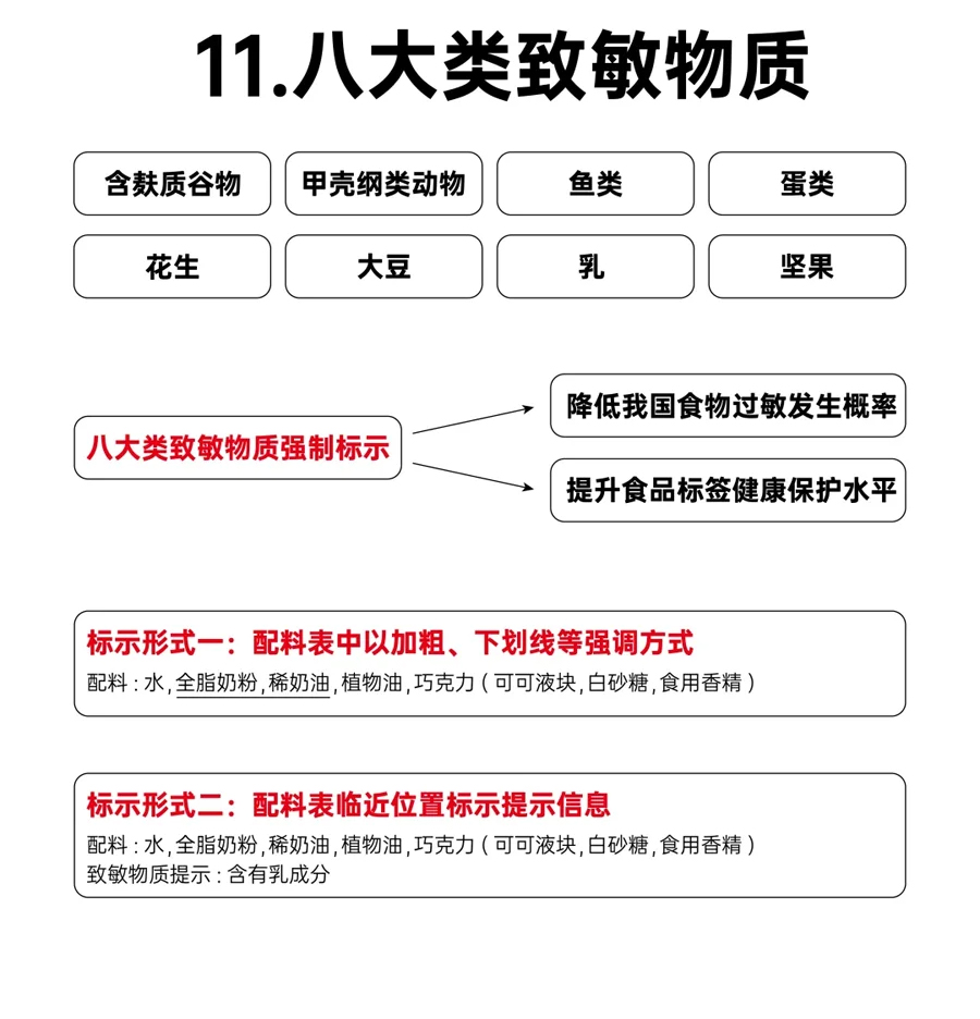 1. 强制标示类别:含麸质谷物及其制品、甲壳纲类动物及其制品、鱼类、蛋类、花生、大豆、乳及乳制品、坚果及其果仁类制品等八大类致敏物质,需在配料表中以加粗 / 下划线形式提示,或在临近位置标注 “含有花生、乳成分” 等信息。