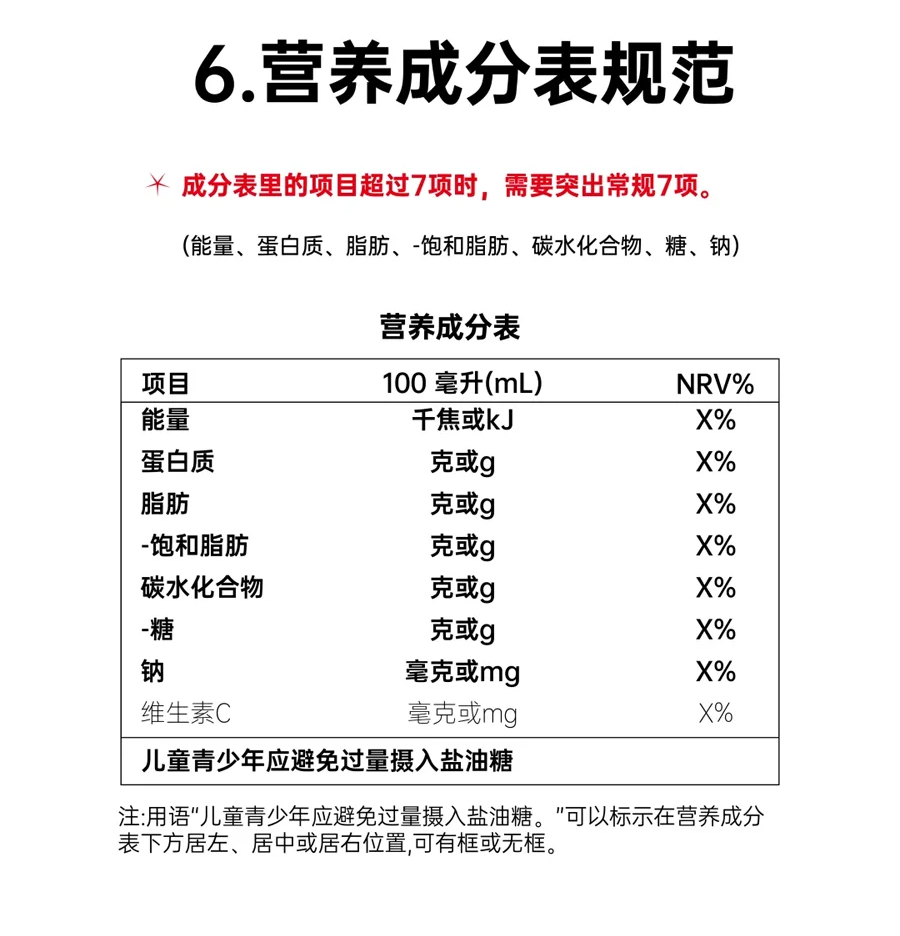 1. 营养标签:需包含能量、蛋白质、脂肪、饱和脂肪、碳水化合物、糖、钠等常规 7 项,超过 7 项时需突出常规项;含量保留小数点后一位,千焦(kJ)小写 k、大写 J;可标注 “儿童青少年应避免过量摄入盐油糖”。