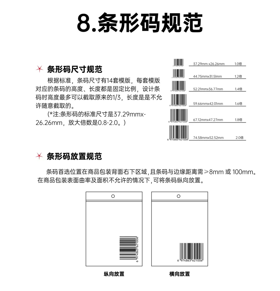 2. 条形码:标准尺寸 37.29mm×26.26mm,放大倍数 0.8-2.0,共 14 套固定比例模版;高度最多可截取 1/3,长度不可随意截取;首选位置为包装背面右下区域,与边缘距离≥8mm 或 100mm,特殊情况可纵向放置。