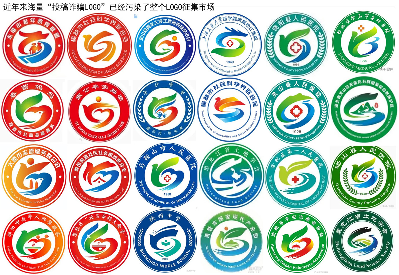 这次永州职业技术学院的新校徽主图形,和其他地区的标识投稿撞了设计逻辑,其实不足为奇,因为这种套路投稿现象已是标识LOGO征集中躲避不过去的现实。国内,有数量庞大的一批人,被陈法奇先生等设计圈人士称之为“投稿诈骗犯”。他们紧盯每一次LOGO征集,不放过每一次征集中奖机会,获取奖金甚至是他们赖以生存的手段,他们惯用的手法是,复用现成的视觉结构,只做简单的色彩调整或元素微调,既能快速完成投稿,又能适配不同征集主题,代价却是丢掉了设计该有的独特性,导致形式雷同的LOGO比比皆是。