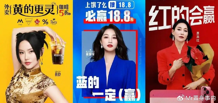 饿了么选择蓝盈莹,同样基于品牌色逻辑。蓝盈莹在语音层面延展出蓝色赢的含义,与饿了么多年建立的蓝色视觉资产形成呼应,名字、品牌色、竞争语境被压缩进同一个传播单元。