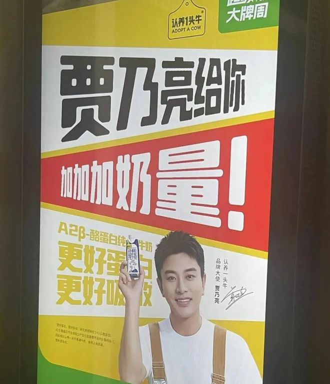 贾乃亮的名字在语音上与加奶量形成高度贴合关系,品牌顺势把代言逻辑放在产品核心利益点上,让明星姓名成为对高奶量、高营养的自然提示。户外广告和终端画面并不复杂,却把信息集中在一个方向上,消费者几乎不需要额外理解成本,就能明白这是一次关于品质和实在感的表达。