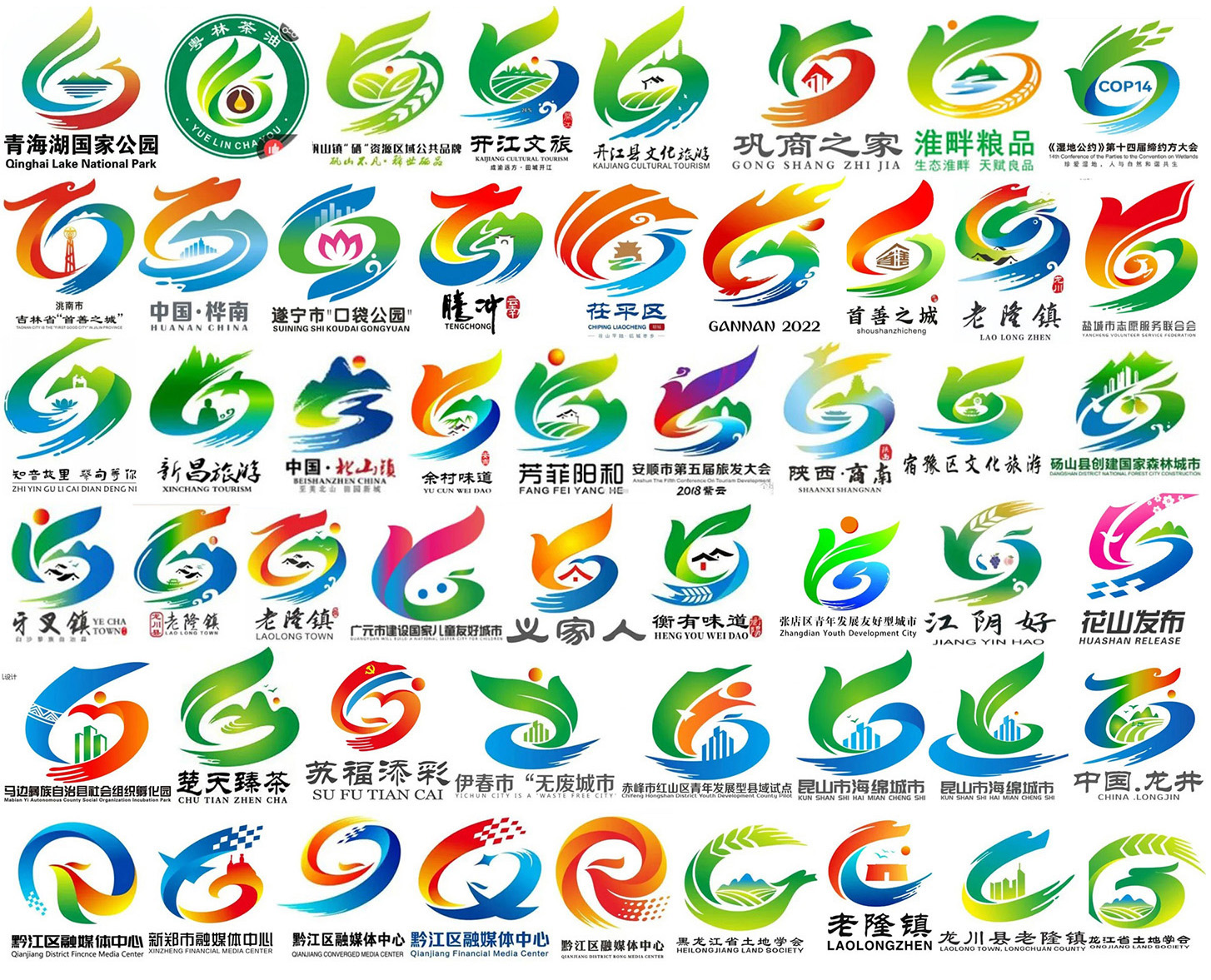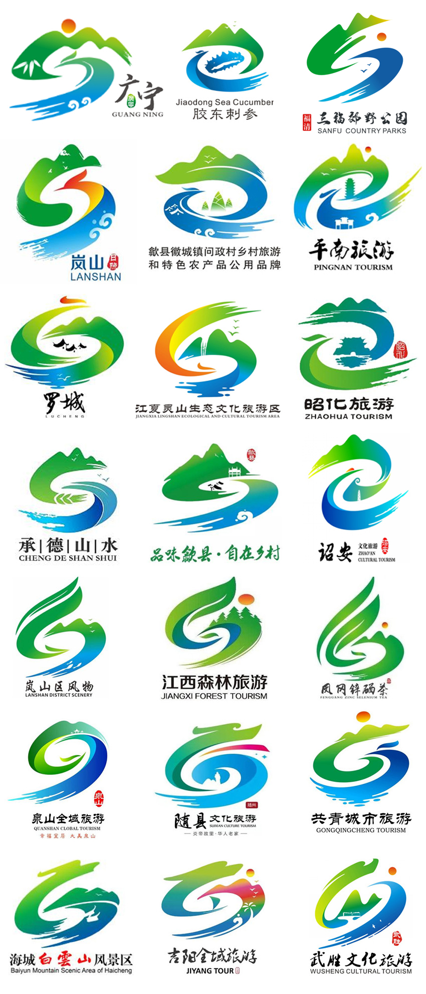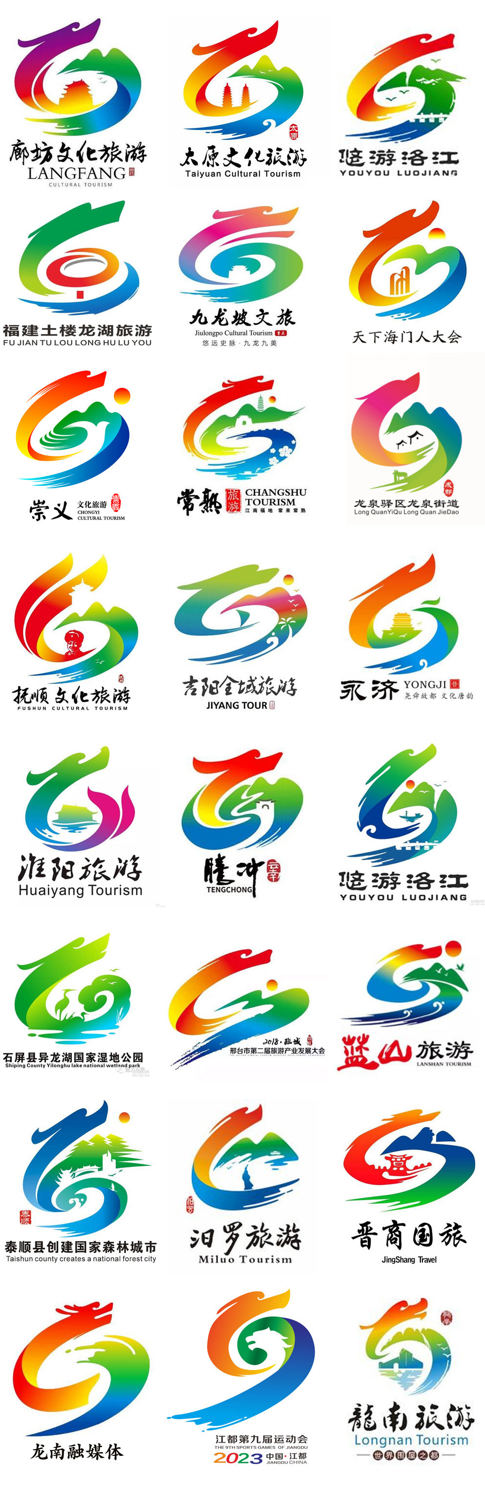 从公示文本看,官方给出的设计解读很完整,龙的灵动形态、南北分界线雕塑的轮廓意象、三山夹一湖的地貌抽象、红蓝渐变对应南北气质、绿色象征生态环保,这些关键词放在任何一个文旅项目里几乎都成立。但标设网发现,这套视觉结构与近年来大量文旅标识高度同构,构图方式、色彩逻辑、笔触语言,和市面上流传的成套模板几乎没有本质区别。