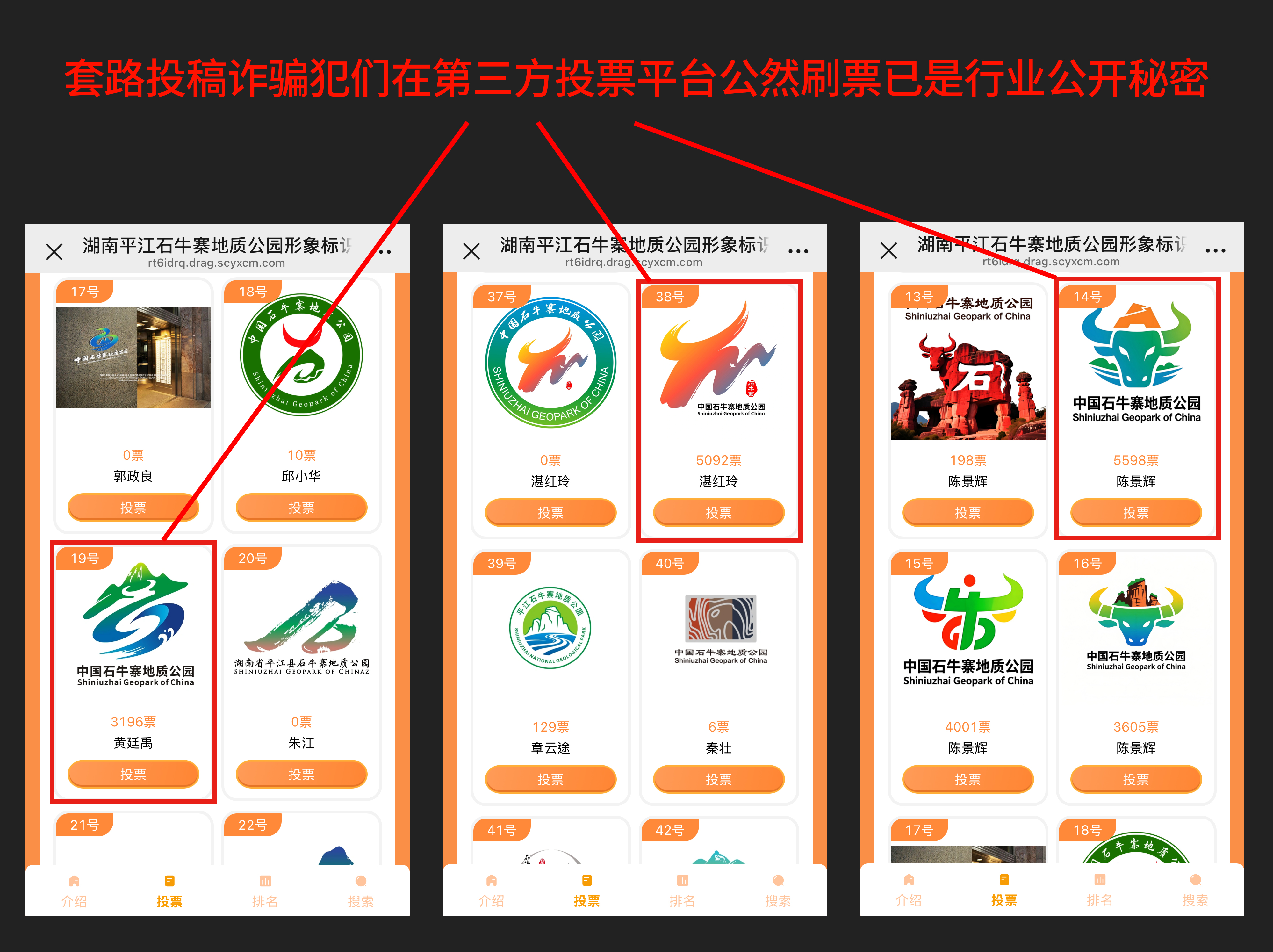 从公示信息和网传截图看,第三方投票平台出现异常数据并非孤例。标设网发现,这类征集活动已经形成固定玩法,套路投稿团队提前准备多套模板方案,再配合刷票和账号矩阵冲榜,一旦有机会就集中投放。评选流程表面完整,实际却很难真正区分原创设计和模板拼装。
