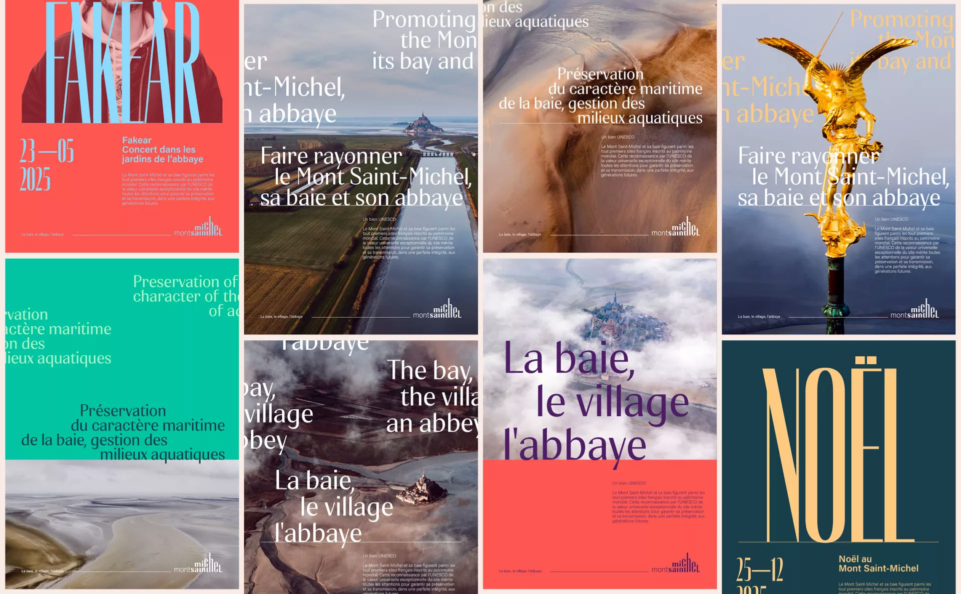 这次并非单一LOGO更新,而是一次完整的品牌视觉系统设计。色彩体系、版式规则、图形语言与摄影风格被统一纳入规范之中,确保圣米歇尔山在官方传播、旅游推广、文化展览等不同语境下,始终呈现统一的品牌形象。标设网认为,这种系统化思维是文化遗产品牌升级中最容易被忽视、却最关键的一环。