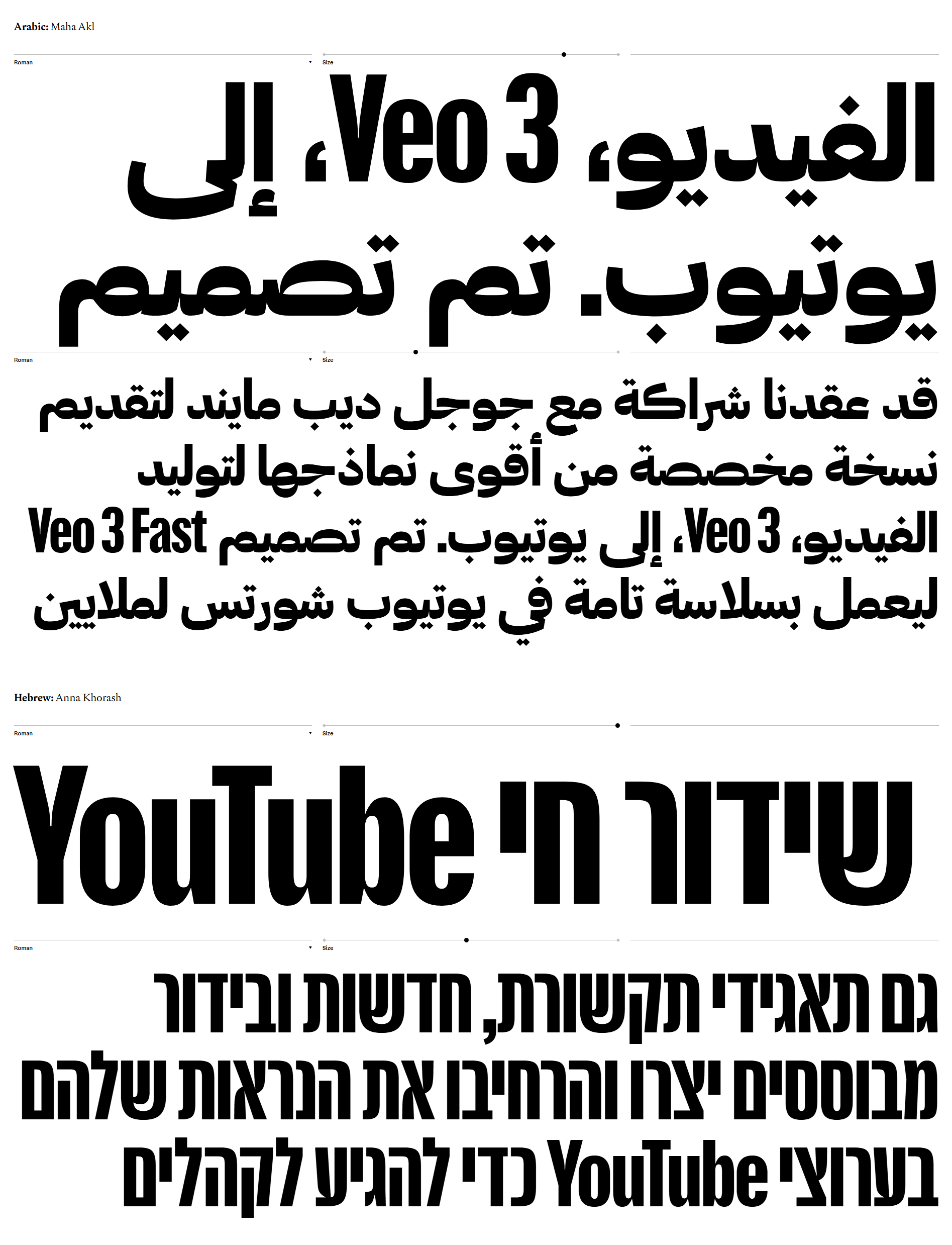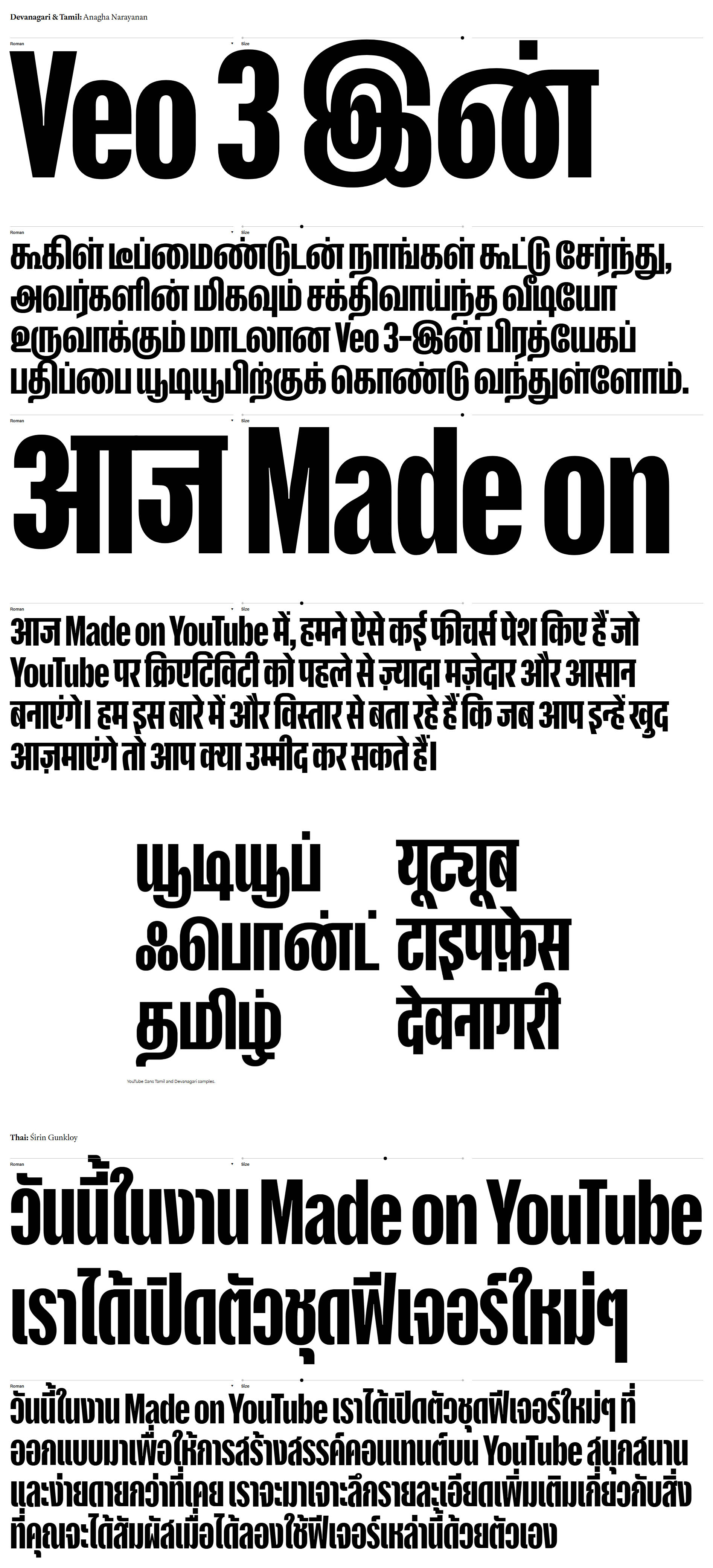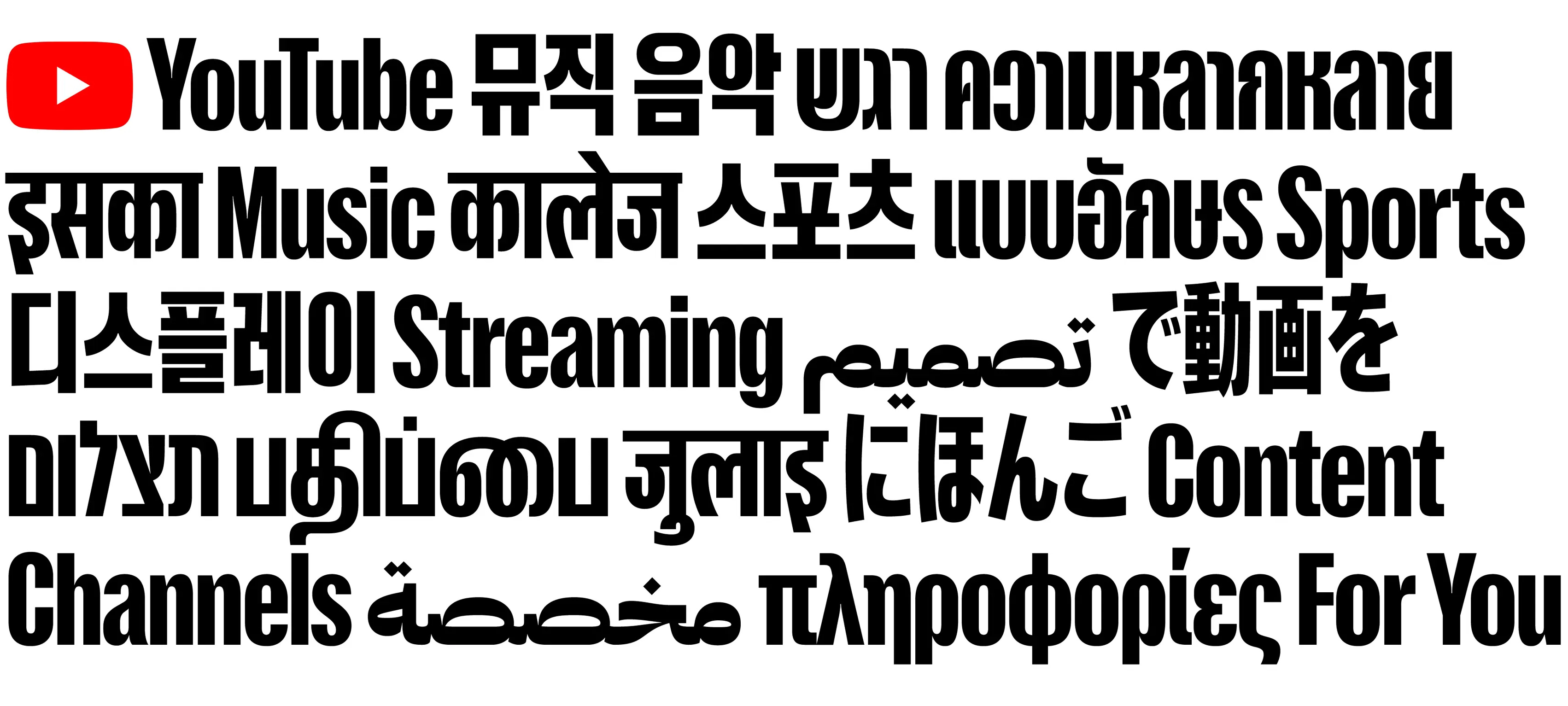 YouTube Display 从一开始就以多脚本支持为前提进行设计,涵盖拉丁文、阿拉伯文、天城文、泰文、韩文、日文等多种书写系统。不同文字在结构、笔画逻辑和阅读习惯上的差异,使统一风格成为设计难点。Sharp Type 并未追求表面的字形相似,而是通过比例、节奏和视觉重心建立跨语言的一致感。标设网认为,这种策略比简单的形态复制更符合全球品牌的长期使用需求。