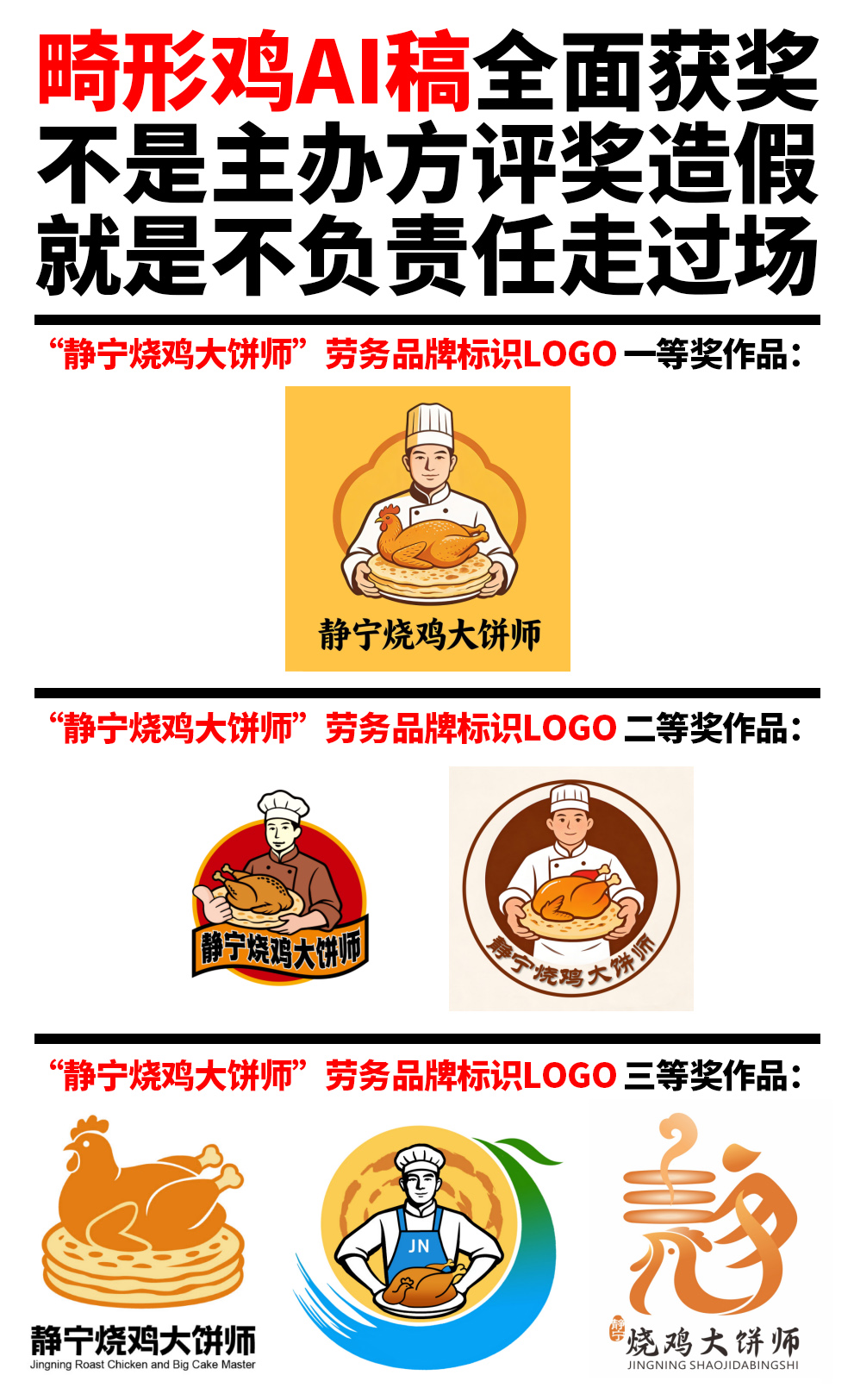 2026年2月11日,静宁县人力资源和社会保障局公示的静宁烧鸡大饼师劳务品牌LOGO获奖作品,标设网发现可能全部为AI生成,且存在明显的AI生成缺陷。