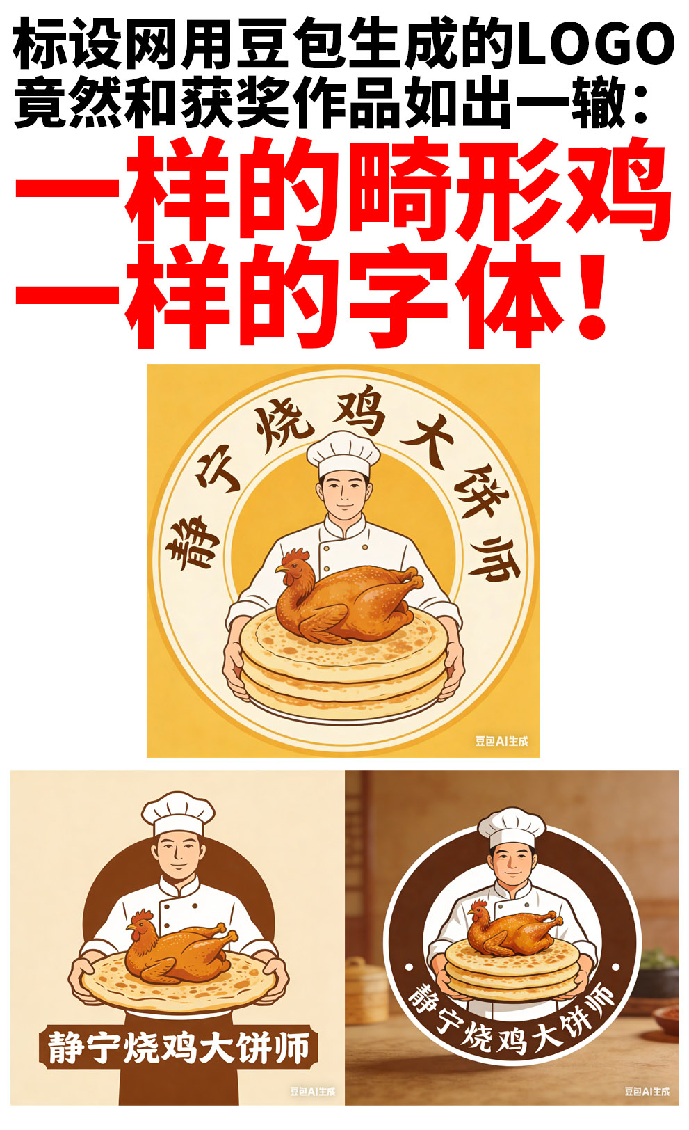 标设网发现,获奖作品中的烧鸡形象存在明显的AI生成缺陷,鸡头反转、鸡爪缺失等问题清晰可见,同时作品字体也与AI生成工具默认输出的字体风格高度吻合。这类缺陷在专业LOGO设计中属于明显瑕疵,本应在评审环节被筛选淘汰。标设网认为,当全部获奖作品都带有AI生成的典型缺陷时,评审过程的严谨性与专业性就值得怀疑。静宁烧鸡大饼师作为地方劳务品牌,其标识设计本应体现地域特色与品牌辨识度,AI生成的同质化作品显然无法满足这一需求。