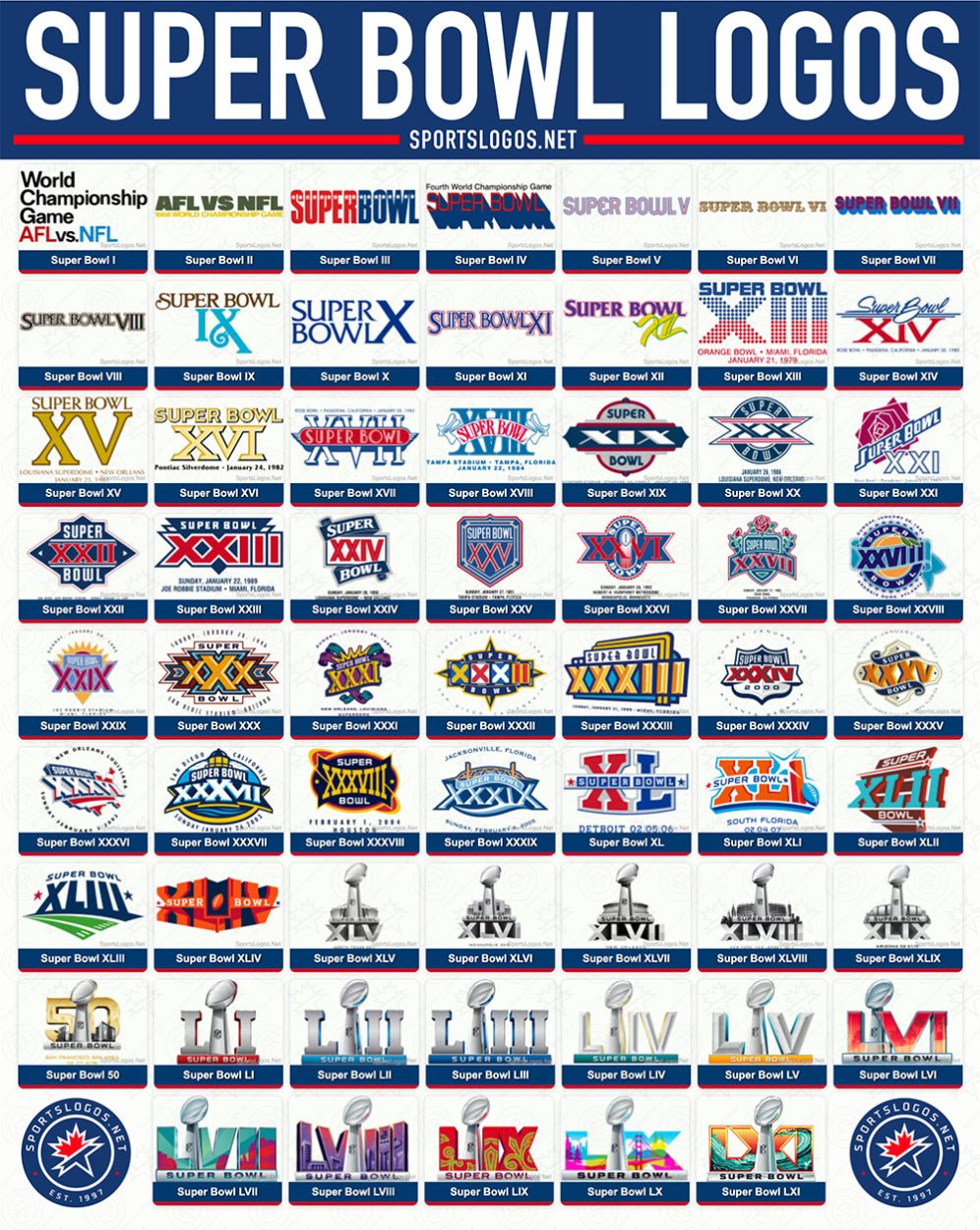超级碗是美国职业橄榄球联盟年度冠军赛,也是全球商业价值最高的单场体育赛事之一。赛事不仅是竞技对决,更是品牌传播、城市营销与娱乐产业联动的重要平台。奖杯形象Vince Lombardi Trophy被持续置于LOGO中心,象征联盟历史与荣誉传承,成为所有视觉更新中保持稳定的精神符号。