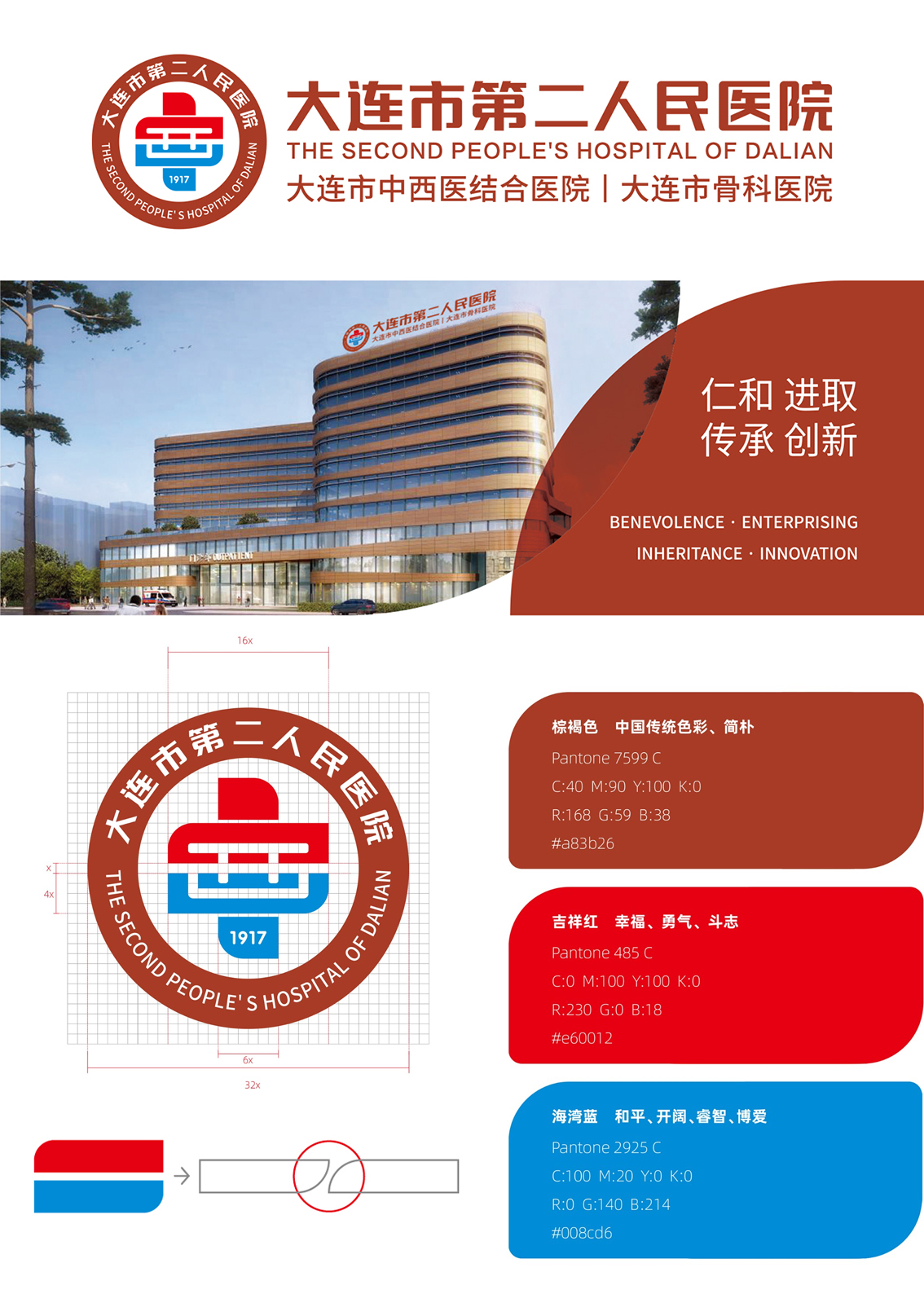 为大连市第二人民医院打造的全新院徽,整体采用圆形构图,寓意和谐、完整、包容,外圈标注中英文名称以提升辨识度;核心图形为融合中西方文字的十字符号,体现中西医结合的特色;在色彩搭配上,红蓝两色融合于十字符号,直观呈现中西医结合理念,还设计了以骨关节为原型的辅助图形,彰显骨科专业实力。