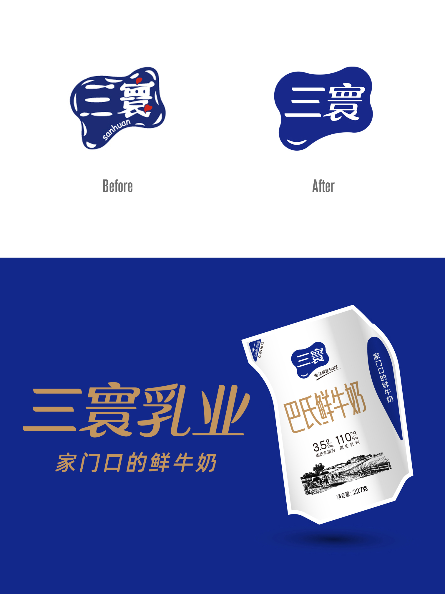 承接大连三寰乳业的LOGO升级重塑项目,保留旧LOGO的奶牛斑纹外形轮廓,对其进行更具设计感和条理性的处理,实现扁平化和现代化诠释,同时为“三寰”字体注入现代美感和力量感,助力品牌在消费升级中找到新定位。