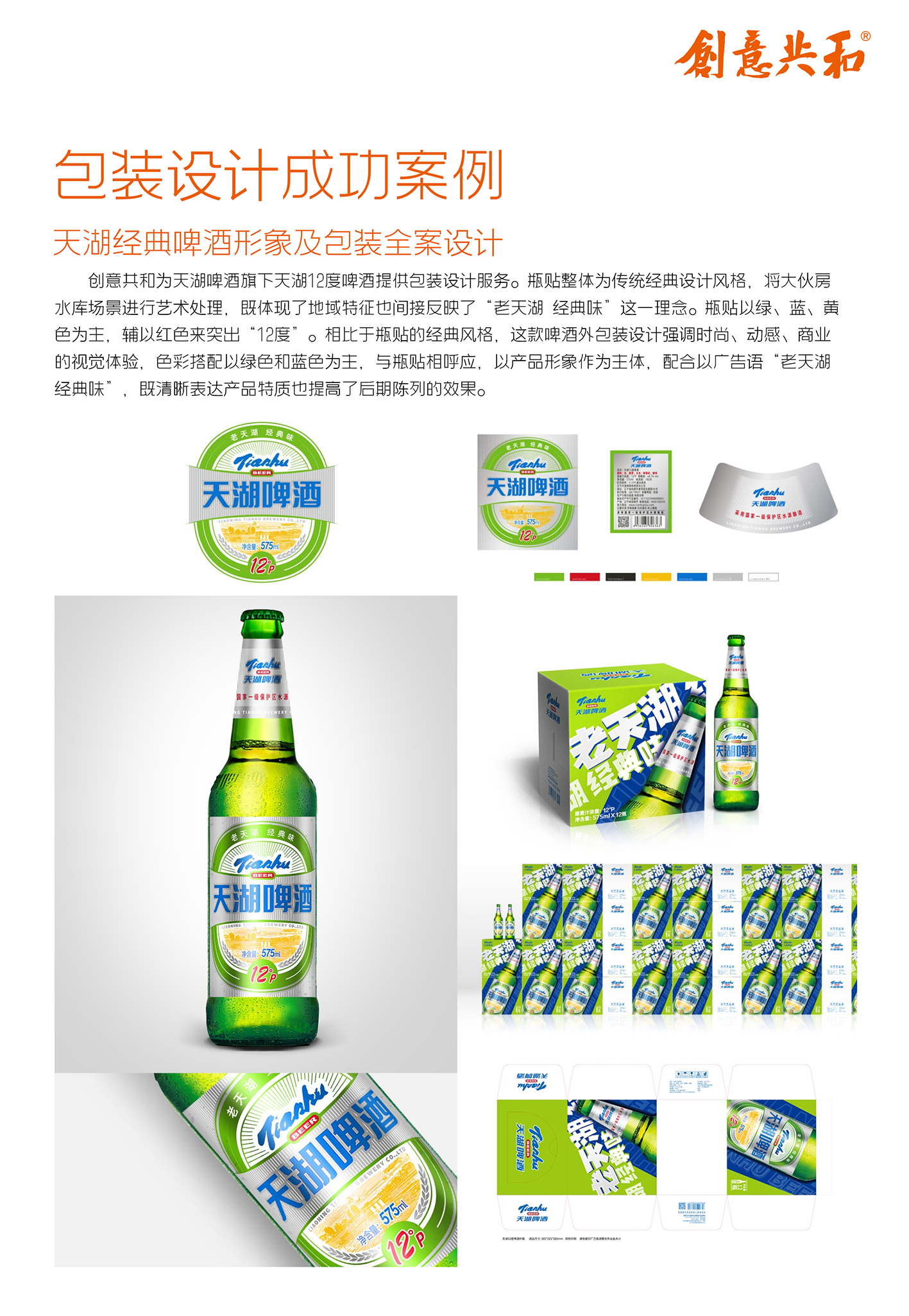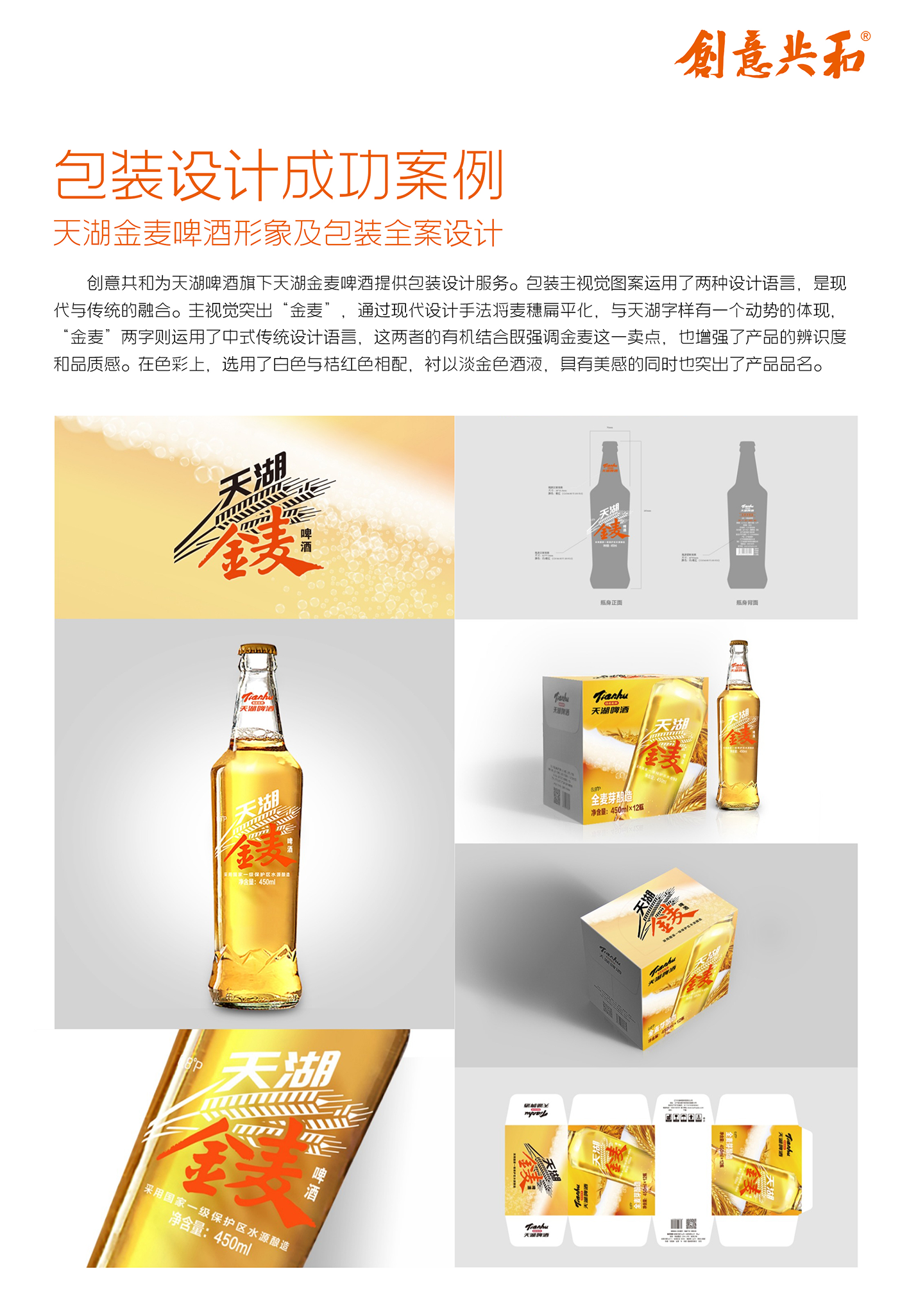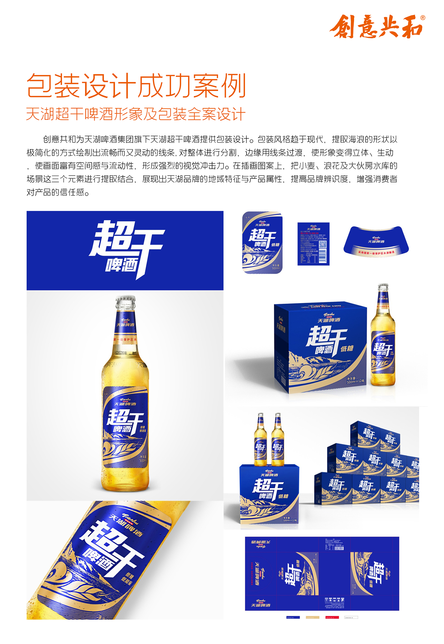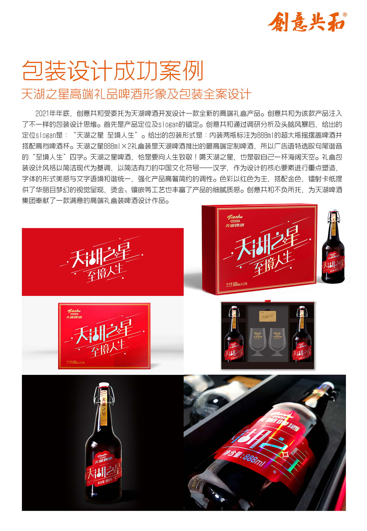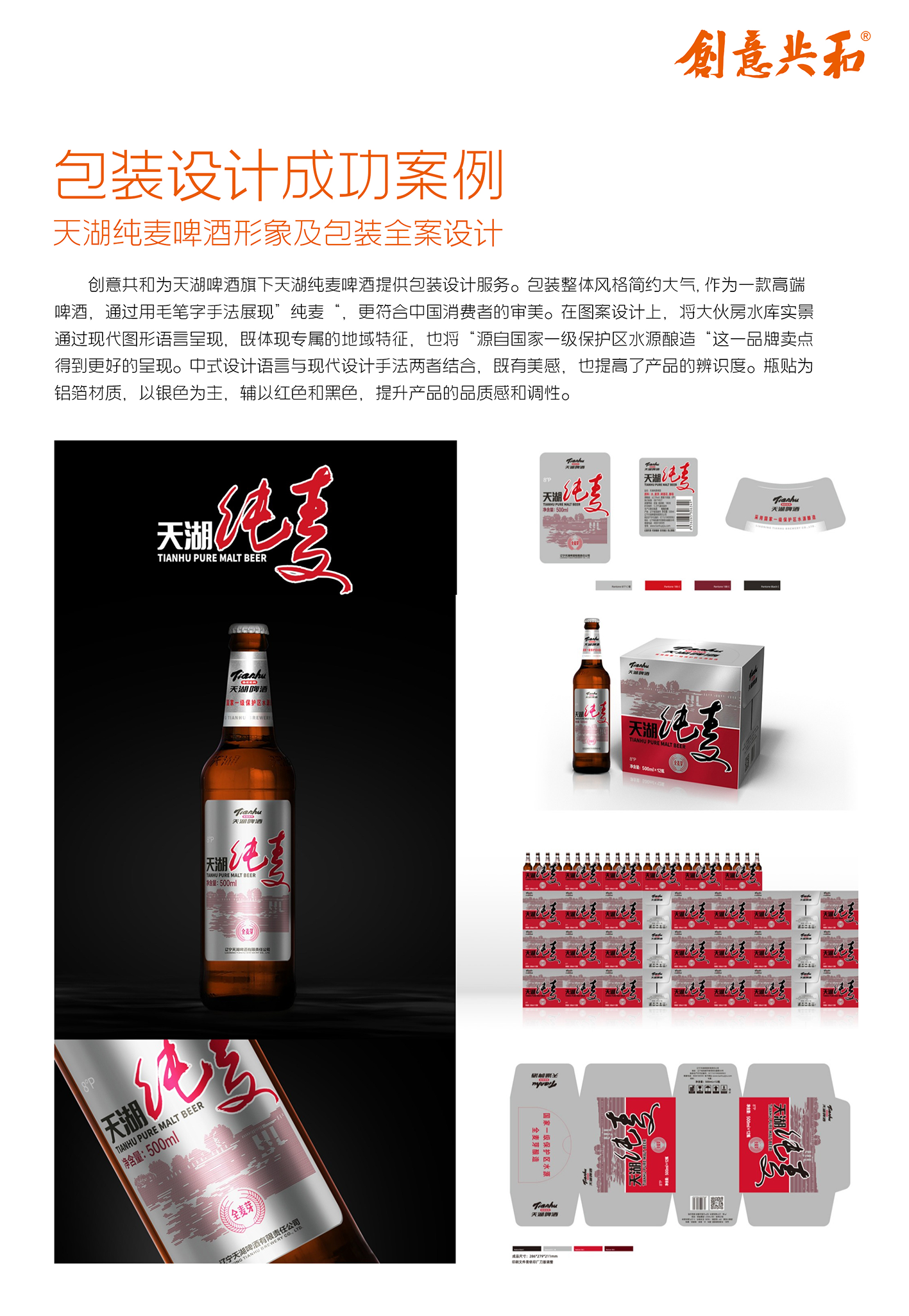 为天湖啤酒集团设计系列啤酒产品包装,为天湖之星高端定制啤酒设计包装,定位为高端礼品市场,提出“天湖之星 至境人生”Slogan,采用两瓶888ml超大瓶配高档酒杯的形式,礼盒以简洁现代为基调,运用红色与金色搭配,展现高奢简约调性;为天湖纯麦啤酒设计包装,风格简约大气,用毛笔字展现“纯麦”,融合大伙房水库实景图案,瓶贴为铝箔材质,以银色为主,提升品质感;此外,还为天湖超干啤酒、经典啤酒、鲜享72小时啤酒、金麦啤酒、IPA啤酒等数十款产品设计了全新包装。